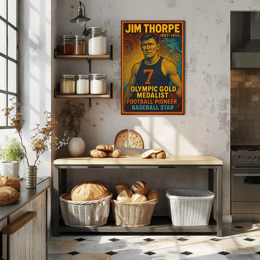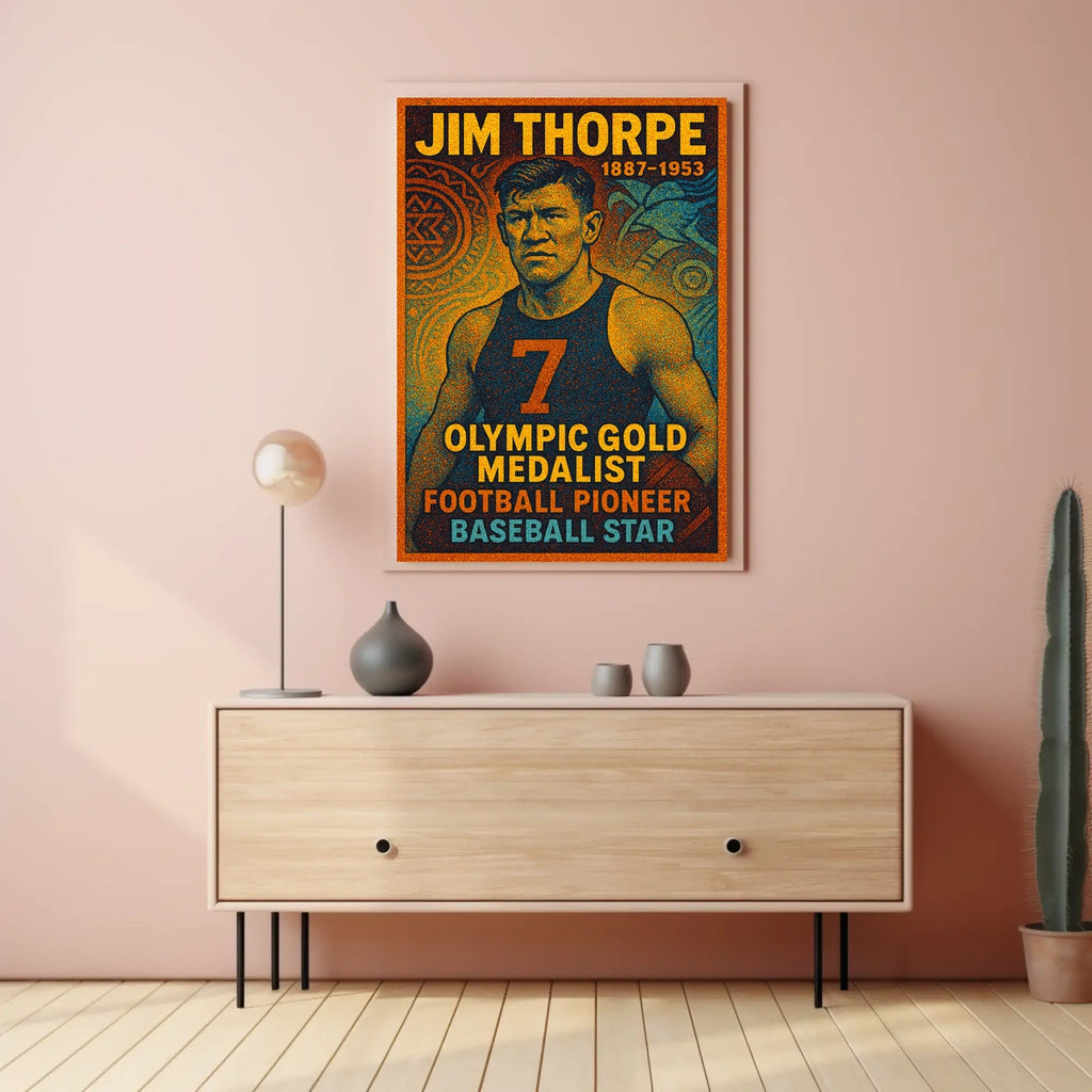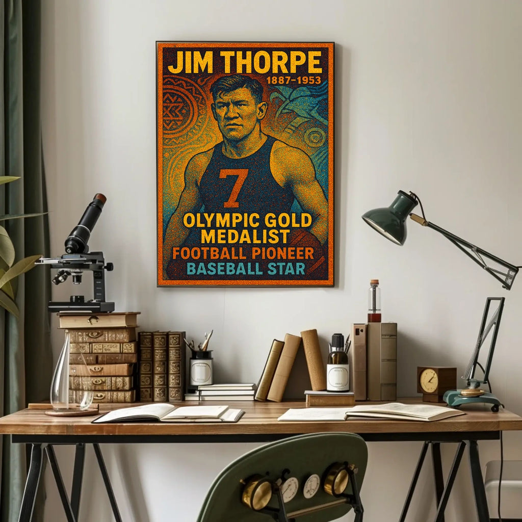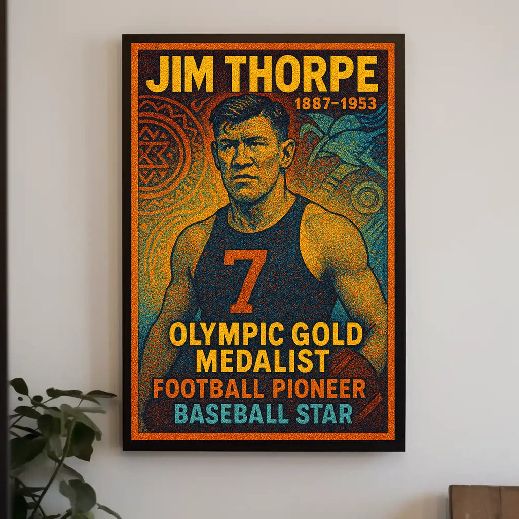 Celebrate the enduring legacy of Jim Thorpe with this captivating poster. Designed for sports enthusiasts and history buffs, it honors a true icon whose achievements spanned Olympic glory and groundbreaking feats in football and baseball. This bold print brings inspiration, pride, and a timeless sense of greatness to any room.