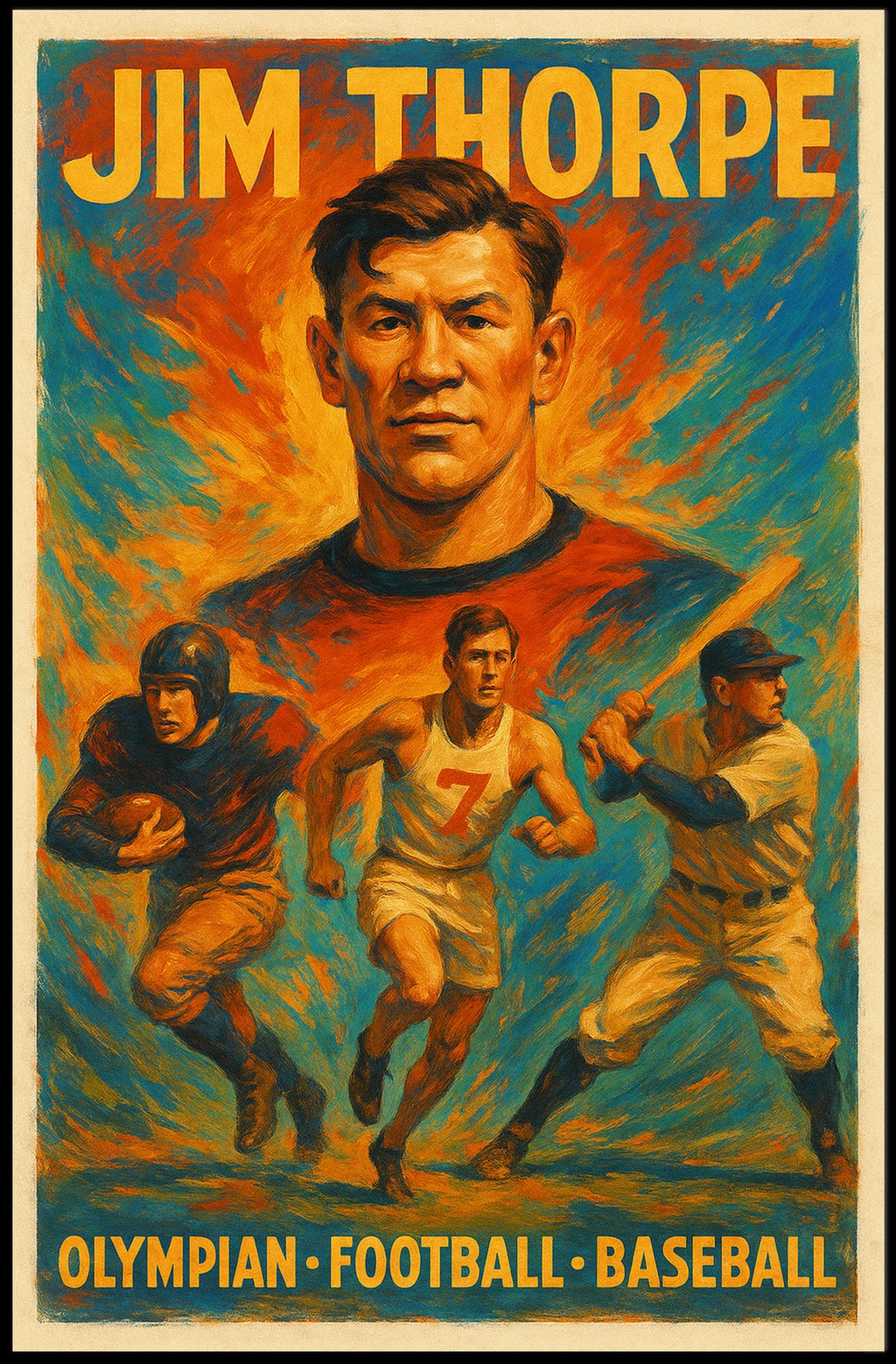 Pay tribute to Jim Thorpe's limitless legacy with a vibrant poster that captures his athletic prowess across Olympian, football, and baseball arenas. This artwork brings Thorpe's dynamic spirit to life, making it a striking centerpiece for any sports lover's space.