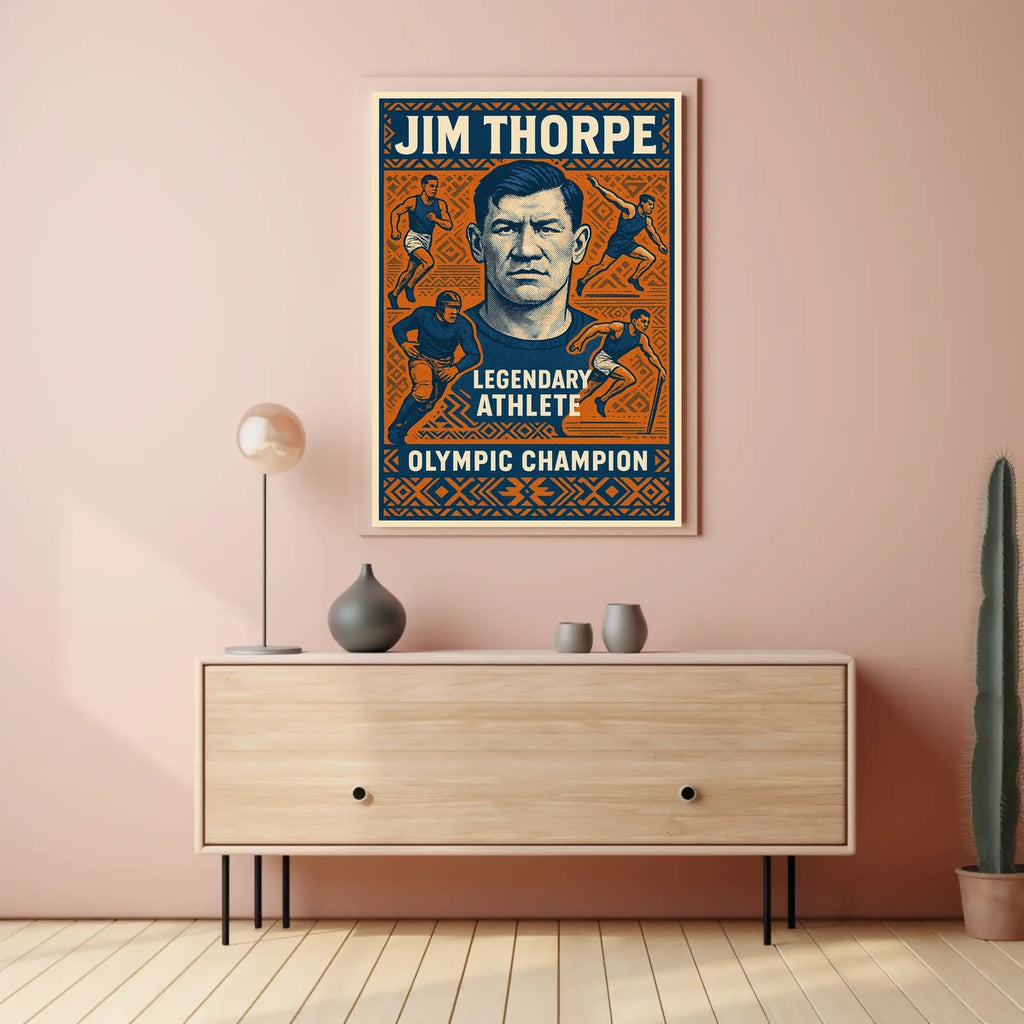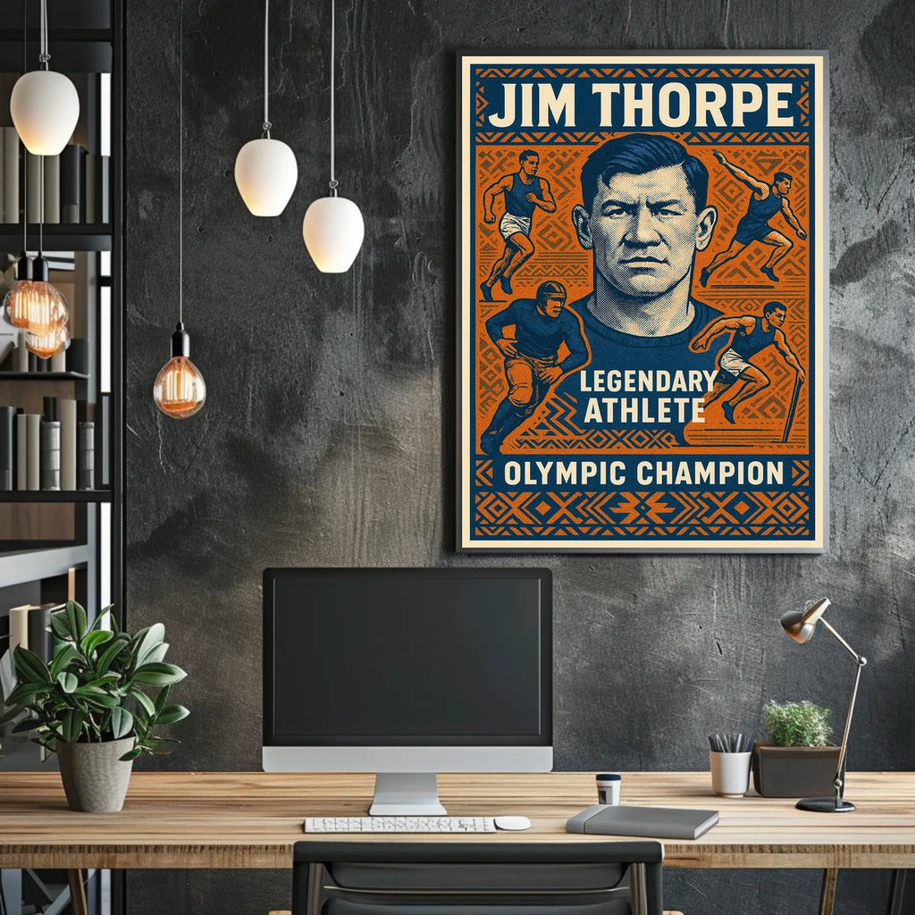 Pay homage to the legendary Jim Thorpe with this captivating poster that blends artful illustration and sports history into one striking wall piece. The design captures Thorpe's unparalleled athletic prowess and enduring legacy, making it a must-have for fans of iconic athletes and Olympic champions alike.