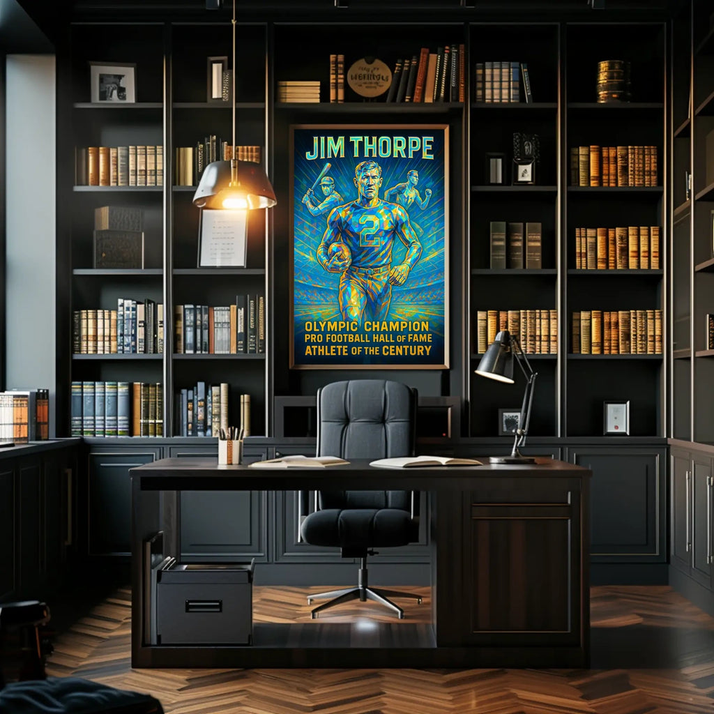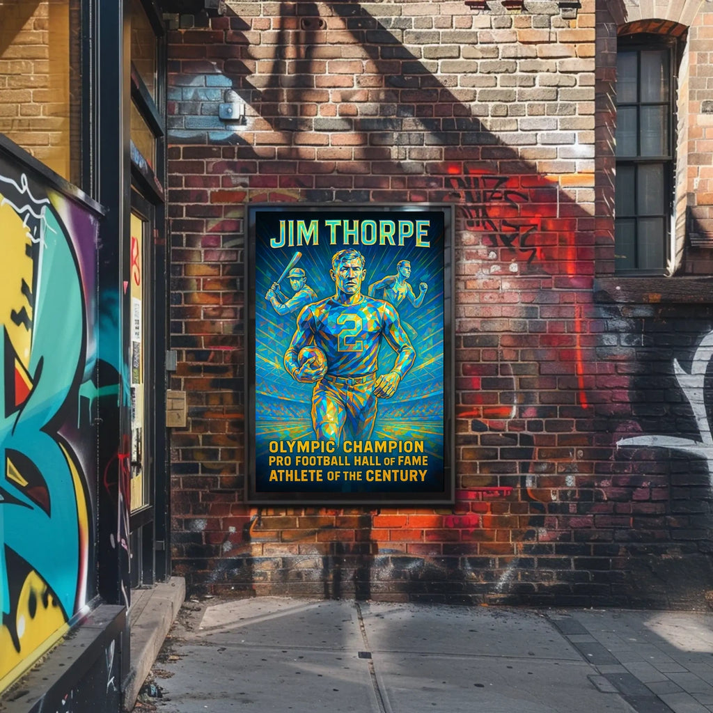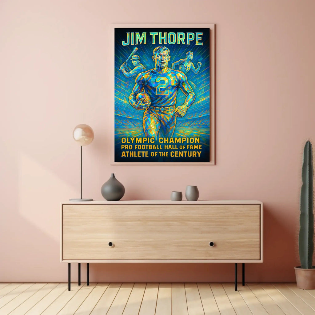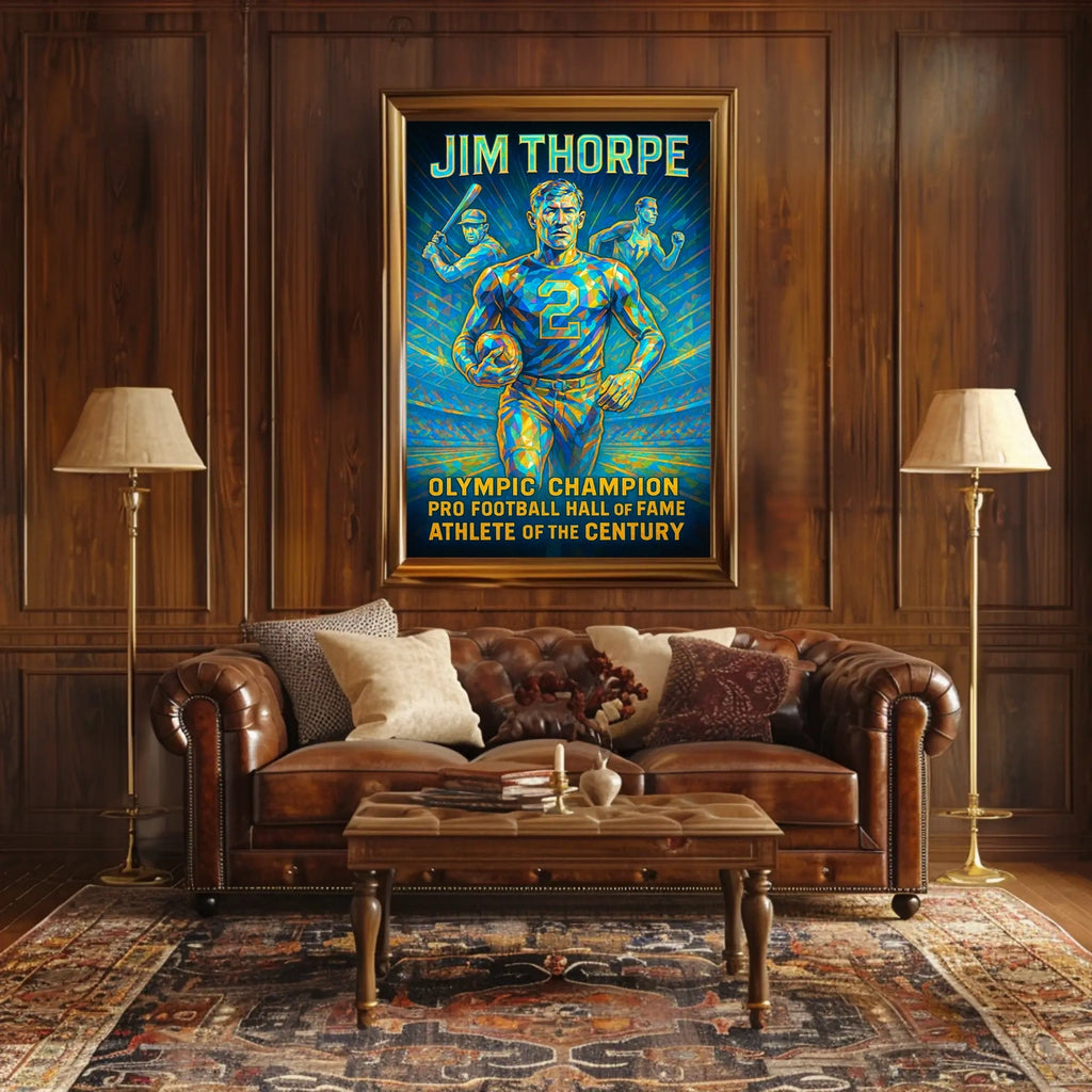 Celebrate the enduring legacy of one of sports' greatest icons with this Celebrating Jim Thorpe Poster. This tribute honors his Olympic Champion achievements and Pro Football Hall of Fame impact, blending bold graphics with timeless inspiration for any wall, gym, or office.