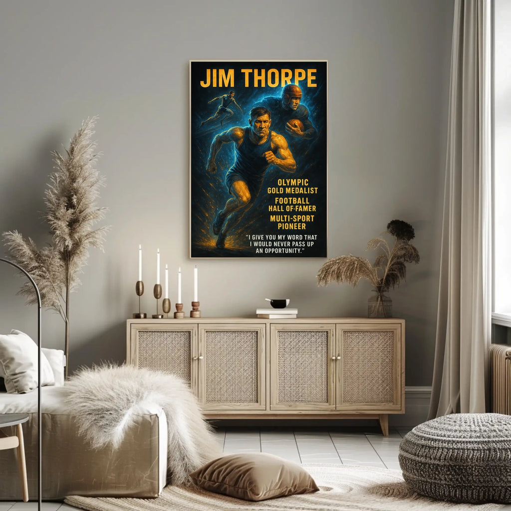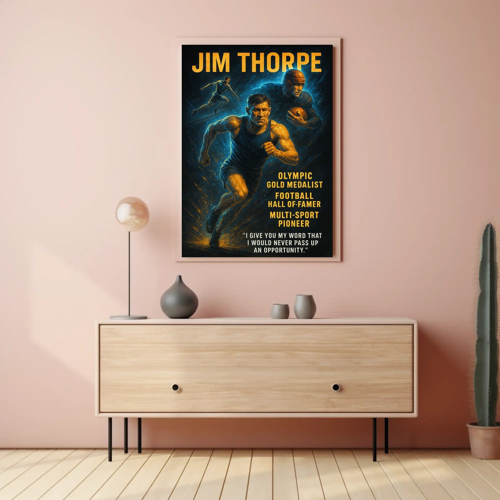 Own a piece of sports history with this Jim Thorpe poster. It merges tribute and inspiration into a single wall reminder that excellence begins with commitment. Order now to elevate your space and stay motivated daily.