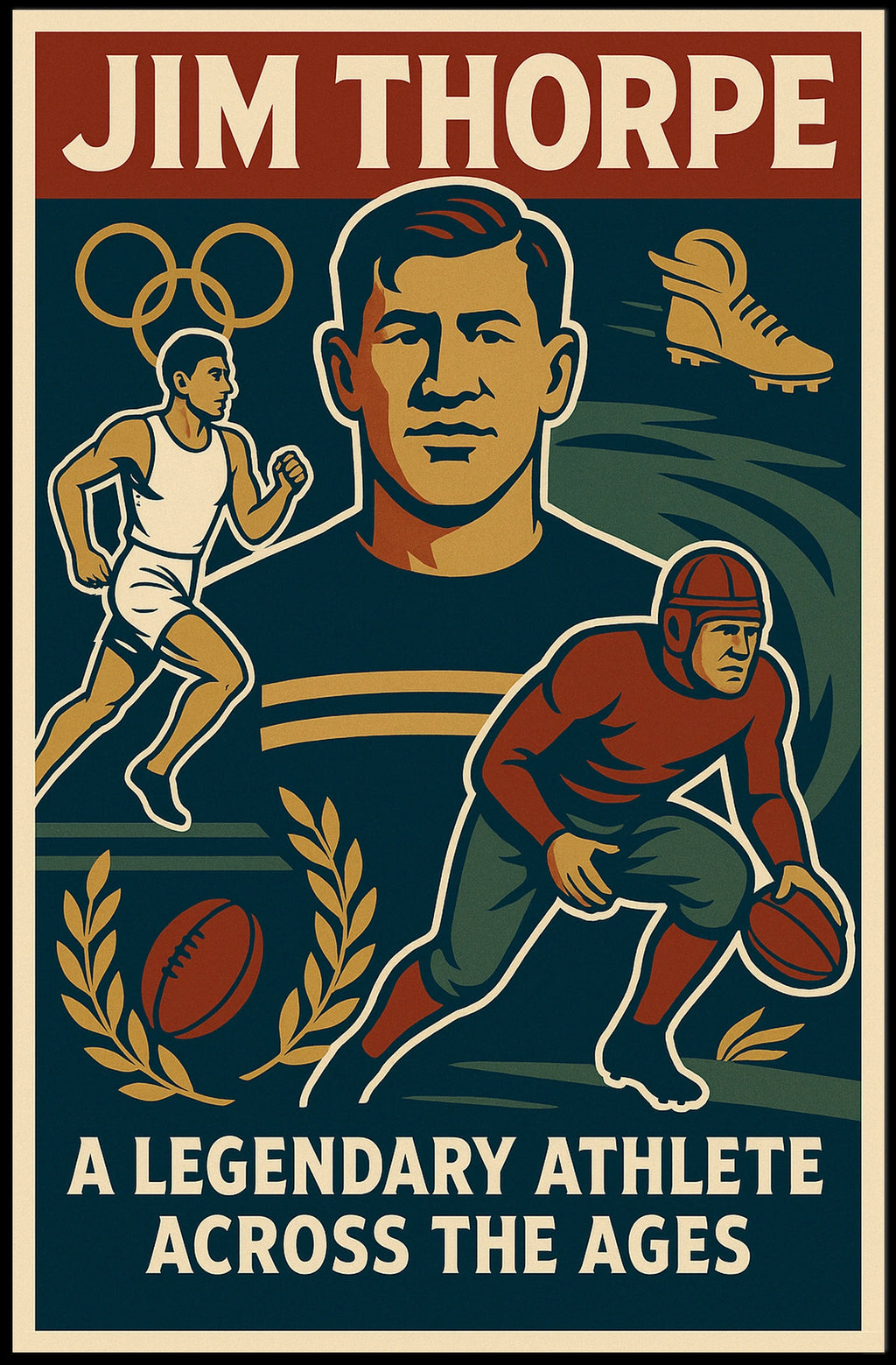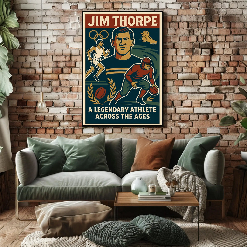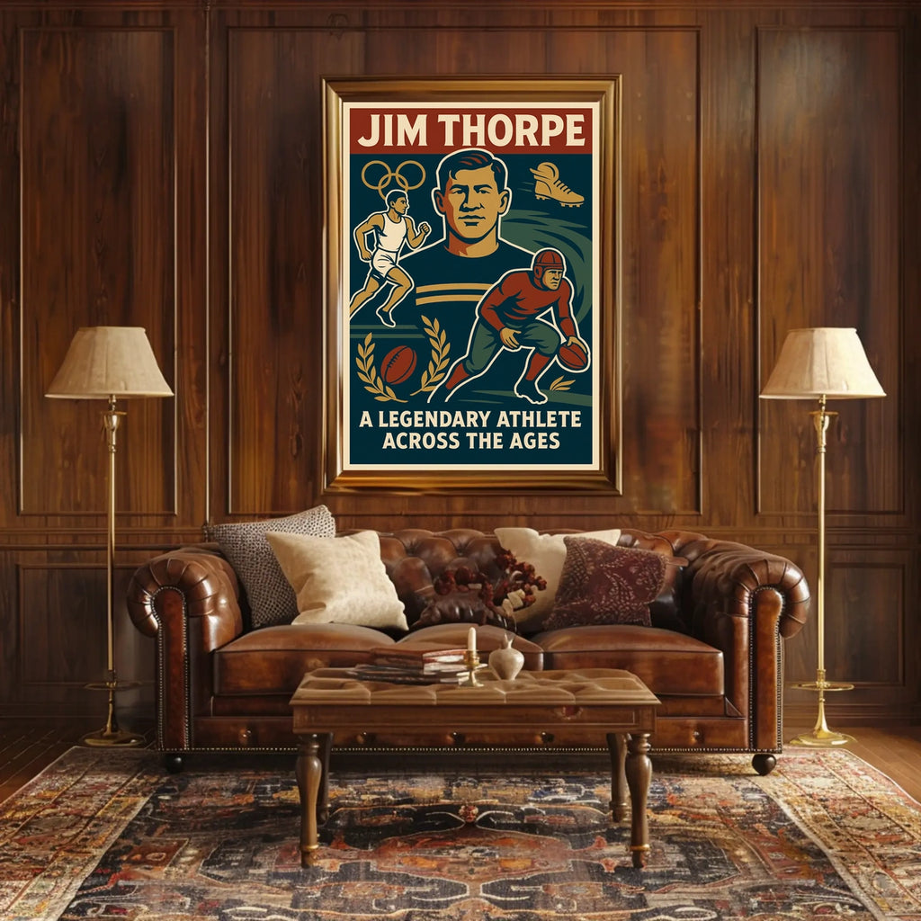 Pay tribute to a sporting legend with this vibrant poster celebrating Jim Thorpe's dynamic legacy across running, football, and Olympic history. The design blends bold silhouettes, motion blur, and vintage flair to evoke the intensity of his era while remaining fresh for today’s walls. Whether you’re decorating a game room, a classroom, or a personal workspace, this piece invites fans to recall a true pioneer who redefined athletic possibility and inspired generations to chase greatness. Its rich texture and carefully calibrated contrast create a focal point that invites conversation and admiration.