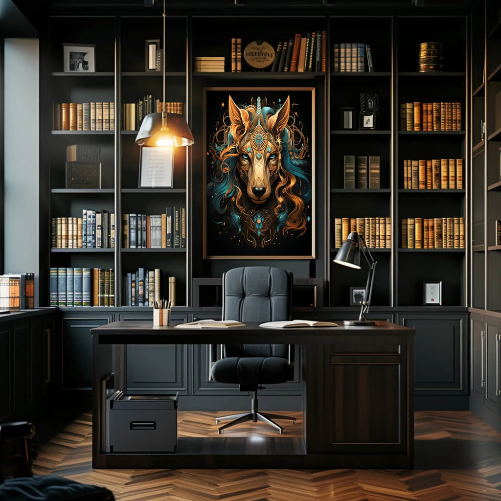 Celestial Guardian invites you into a realm where fantasy meets refined decor. This fox artwork blends celestial motifs with a regal gold and turquoise palette, delivering a statement piece that adds wonder and elegance to any space.