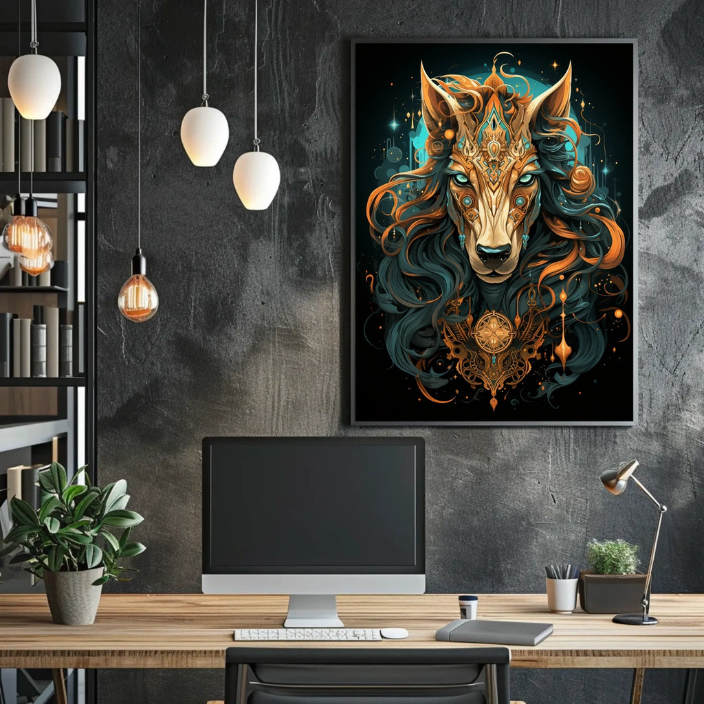 Elevate your space with this celestial guardian. Invest in timeless art that resonates with fantasy lovers and nature-inspired decor fans alike. Add to cart today and let this majestic wolf lead your room's story.