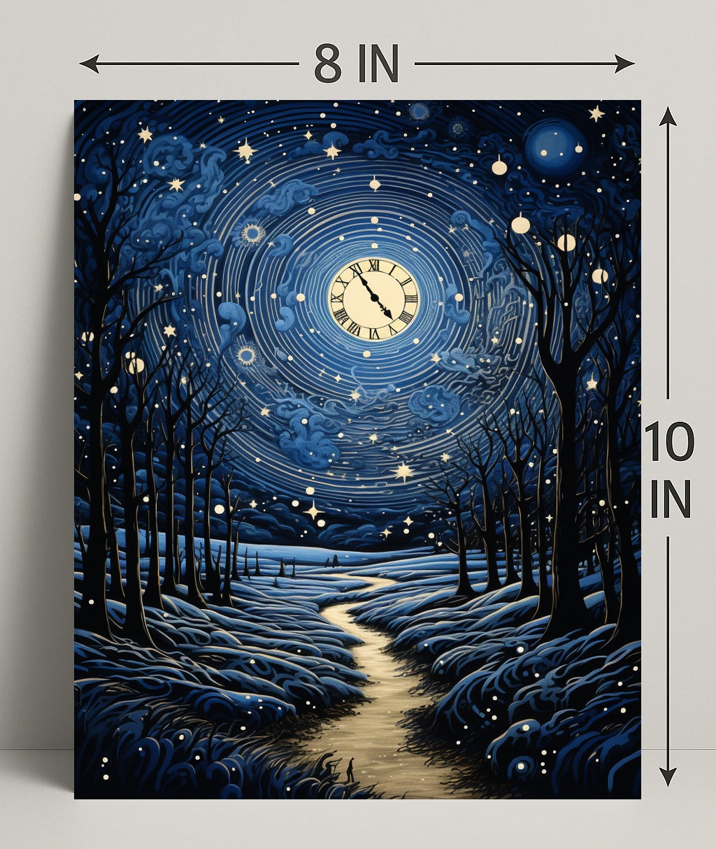 Striking visual elements: luminous clock-moon, swirling starlit sky, silhouetted trees, and a golden meandering path that creates movement and depth.