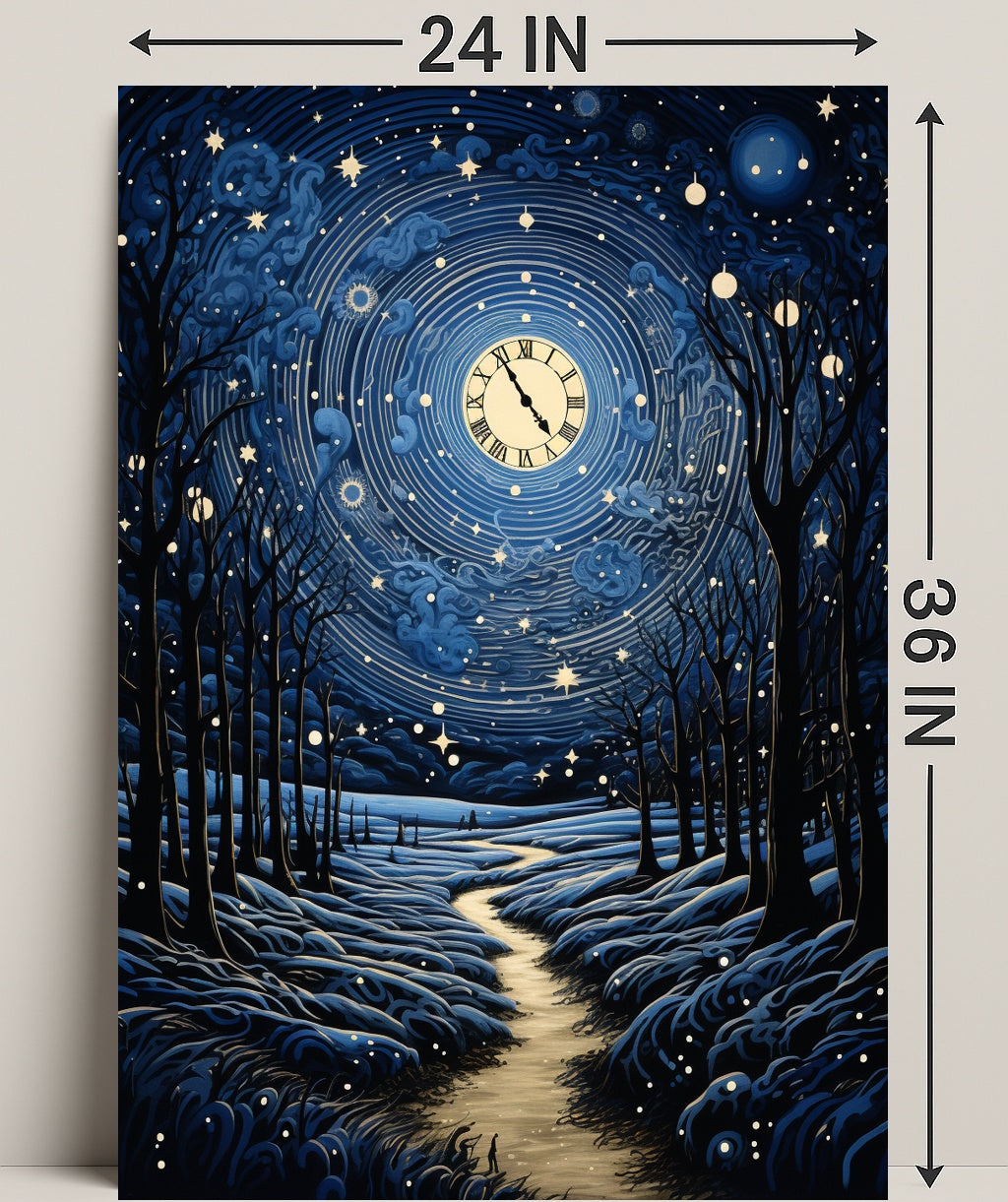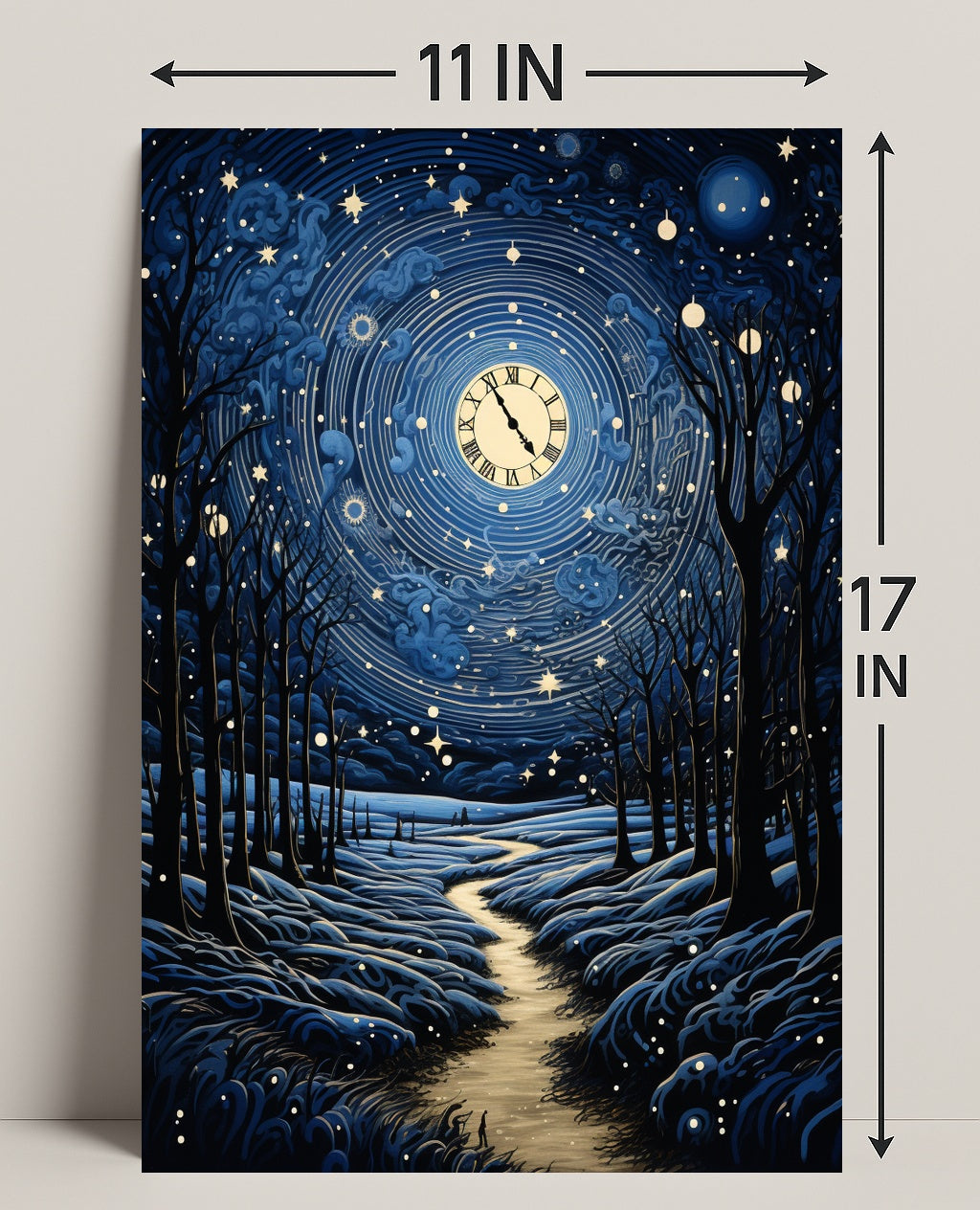 Bring the magic of a starry evening into your home with the Celestial Nightscape Poster from PosterGoat. This evocative art print merges dreamy, minimalist design with rich, painterly detail — a swirling navy sky punctuated by starlight and a clock-like moon, framed by stark tree silhouettes and a glowing, winding path that draws the eye into a serene nocturnal landscape.