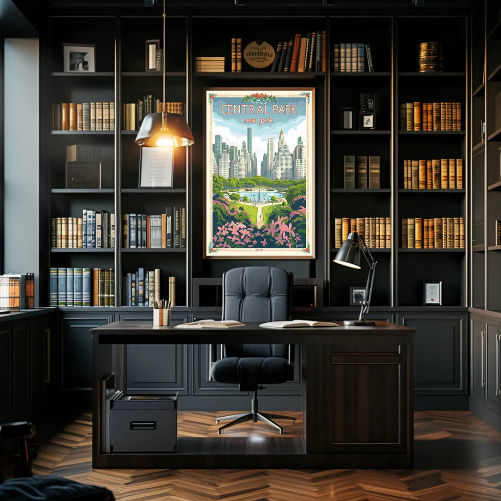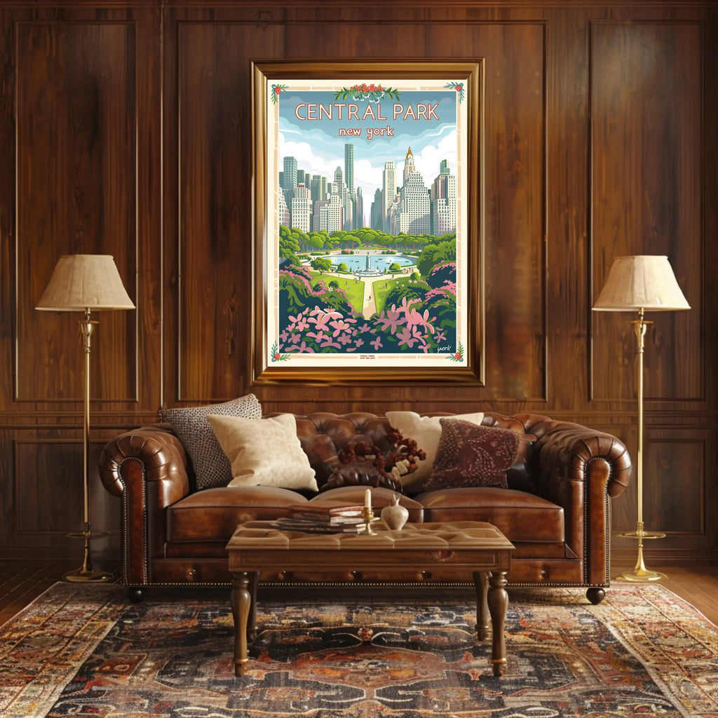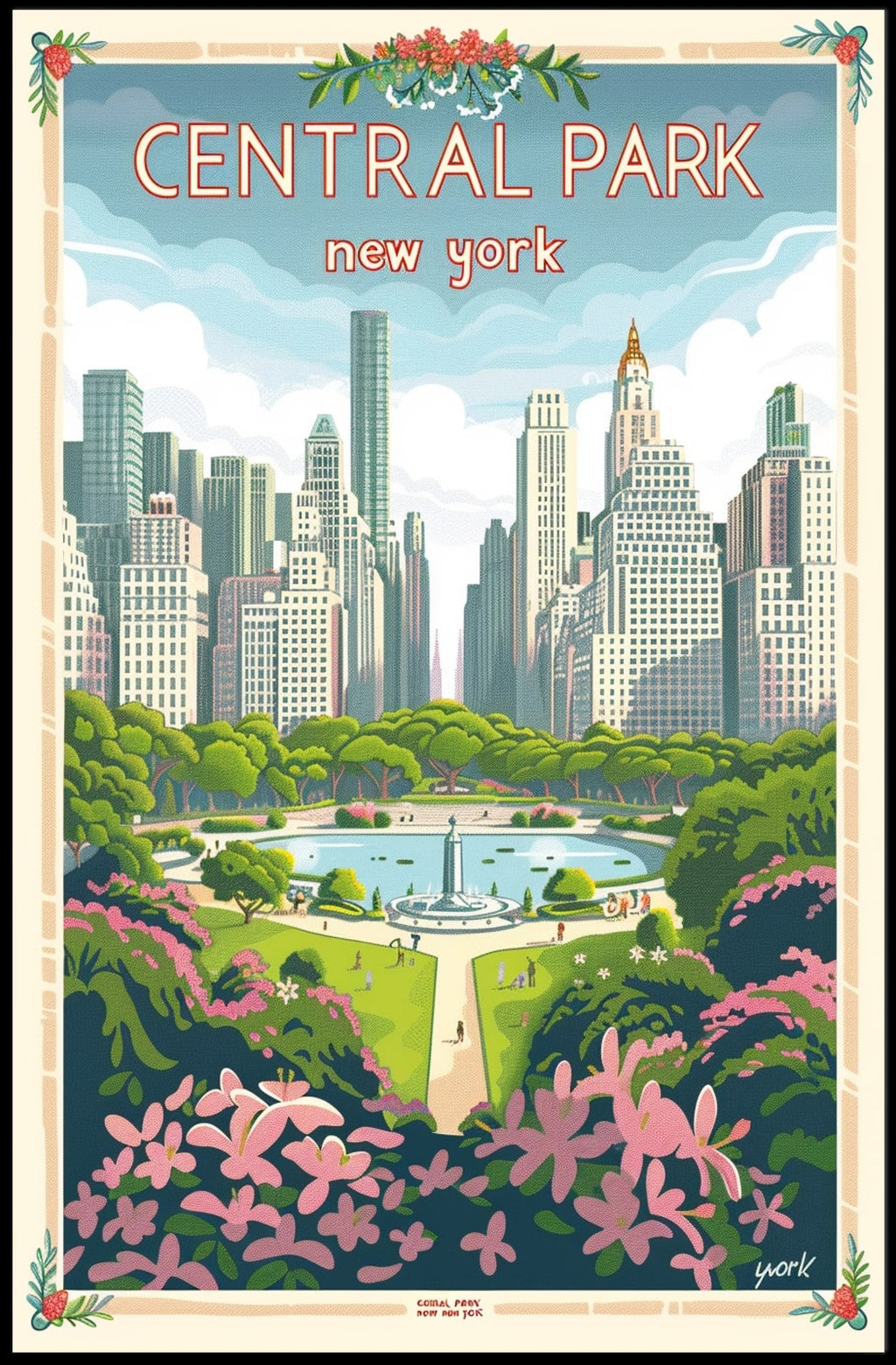 Immerse yourself in a vibrant depiction of Central Park, showcasing the lush greenery and vibrant pink flowers that adorn this urban oasis. This vintage-style illustration captures the iconic New York City skyline towering in the background, offering a harmonious blend of nature and metropolis. The artist skillfully uses pastel colors to evoke a sense of nostalgia and serenity, inviting viewers to appreciate the tranquil beauty amidst the city's hustle and bustle. Perfect for travel enthusiasts and vintage art collectors, this poster brings a touch of cheerful charm and sophistication to any space.