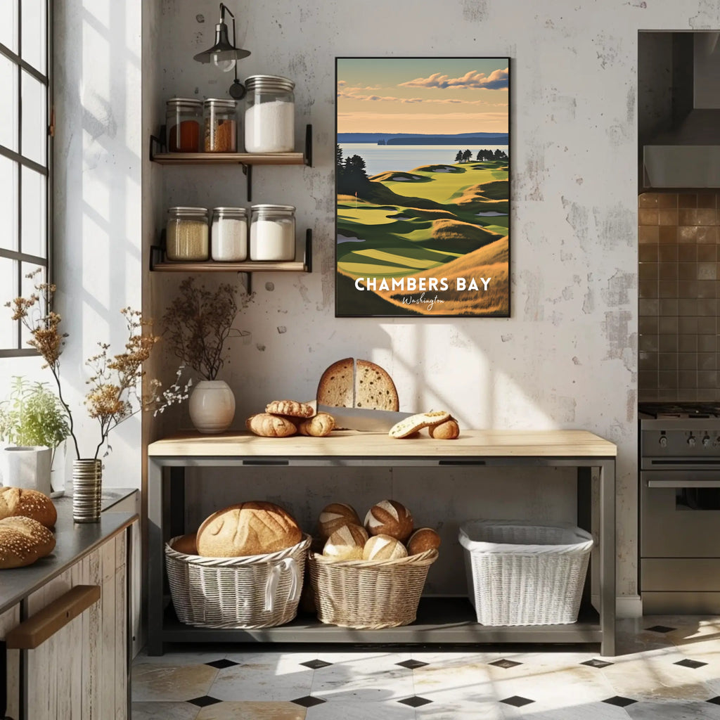 This Chambers Bay poster evokes the strategic challenges of the course while celebrating its sweeping coastal scenery — a must-have piece for collectors of golf art and scenic posters.