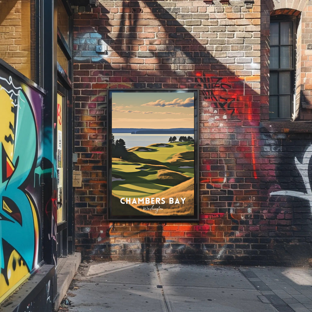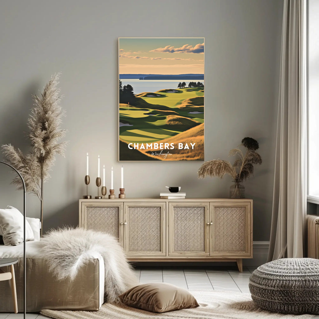 Chambers Bay Golf Course Scenic Sports Poster from PosterGoat captures the windswept beauty of Chambers Bay, Washington in a clean, illustrative style that suits minimalist and mid-century modern interiors. This scenic sports poster highlights rolling dunes, sculpted greens, strategic sand traps and a calm Puget Sound horizon — an elegant tribute to one of the Pacific Northwest’s premier golf destinations.