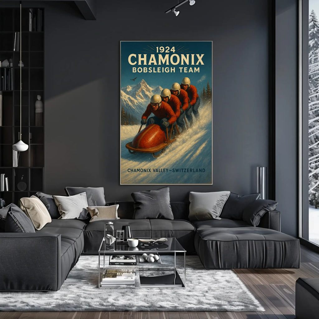 Elevate your space with curated art that blends history and style. This poster offers a conversation-ready focal point, a dash of wanderlust, and enduring appeal—perfect for elevating any room. Shop now and bring the Chamonix Bobsleigh Team 1924 scene to life.