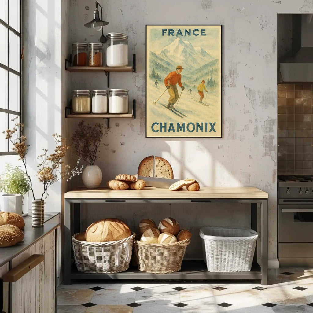 This Chamonix skiing art blends the charm of retro travel decor with the refined aesthetics of watercolor-style posters, offering an alpine landscape poster that enhances living rooms, studies, galleries, or office spaces. A perfect gift for lovers of French Alps art, nostalgic ski art, and vintage travel posters, it invites a sense of adventure and timeless elegance into any setting.