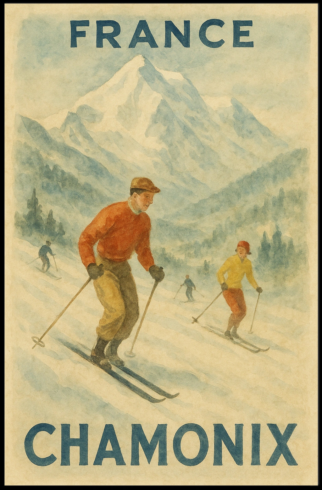 Experience the thrill of skiing with this enchanting vintage travel poster featuring the picturesque beauty of Chamonix, France. This artwork captures the essence of adventure, showcasing skiers in charming vintage attire gracefully navigating down a snowy slope amidst towering pine trees. The watercolor-like illustrations evoke a nostalgic feel reminiscent of early 20th-century travel posters, inviting viewers to explore the exhilarating world of winter sports. Perfect for winter enthusiasts and art aficionados alike, this poster adds a touch of nostalgia and elegance to any space, celebrating the majestic allure of alpine landscapes and the timeless spirit of skiing.