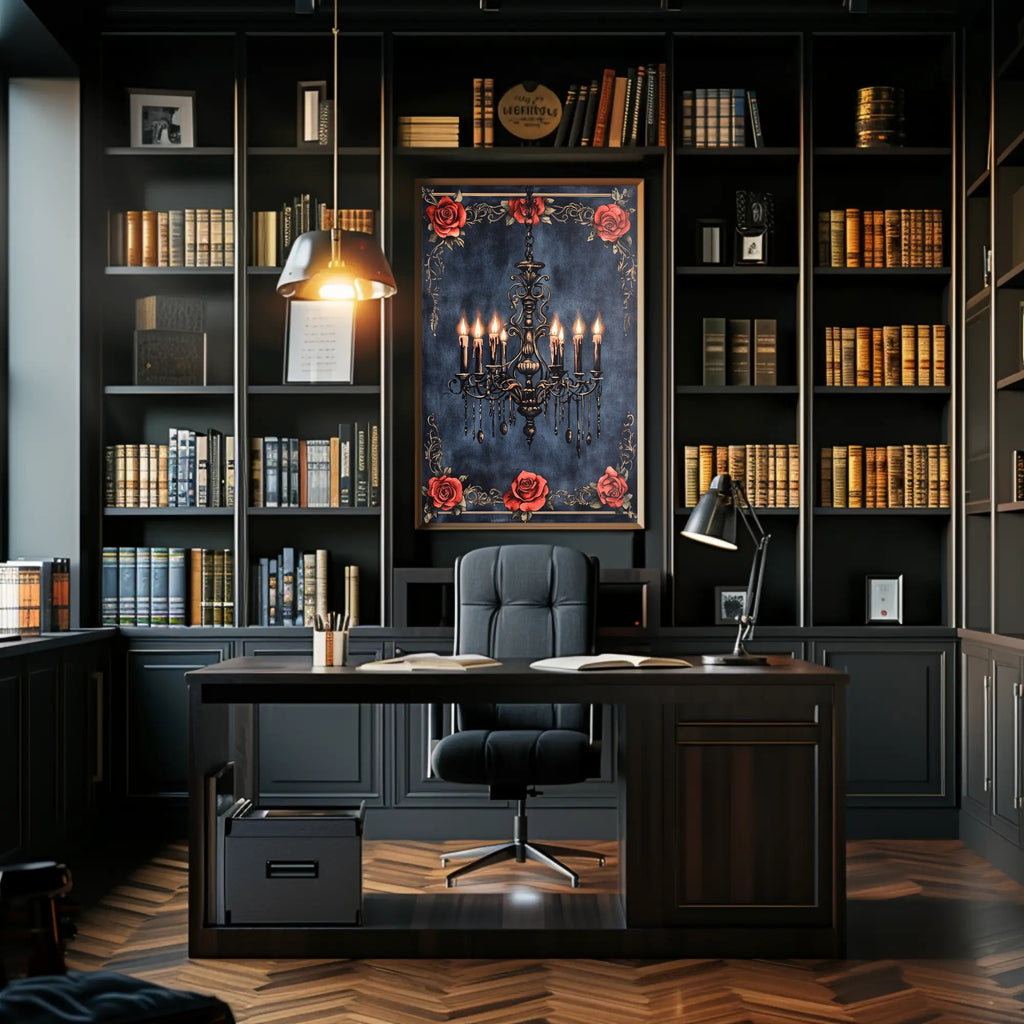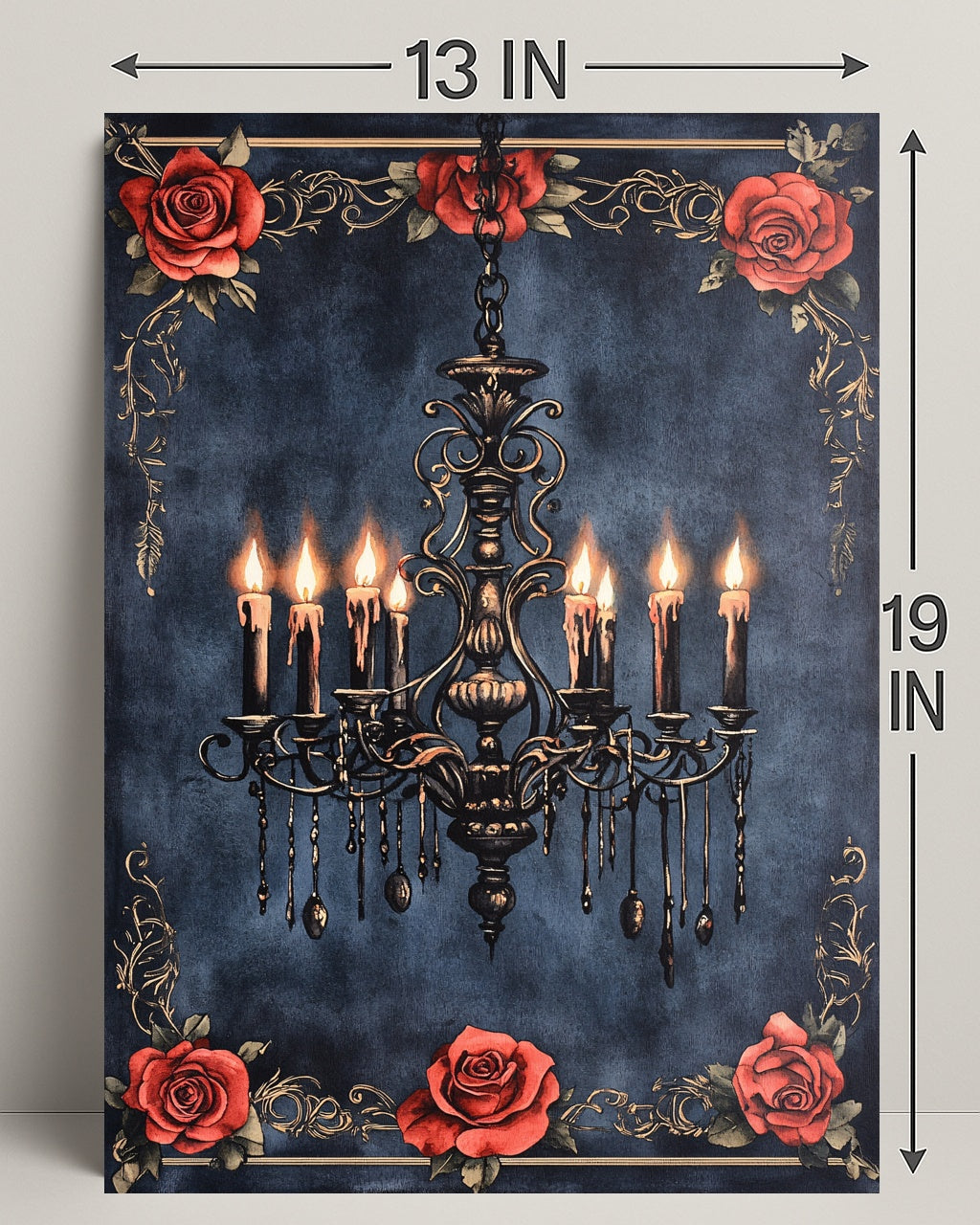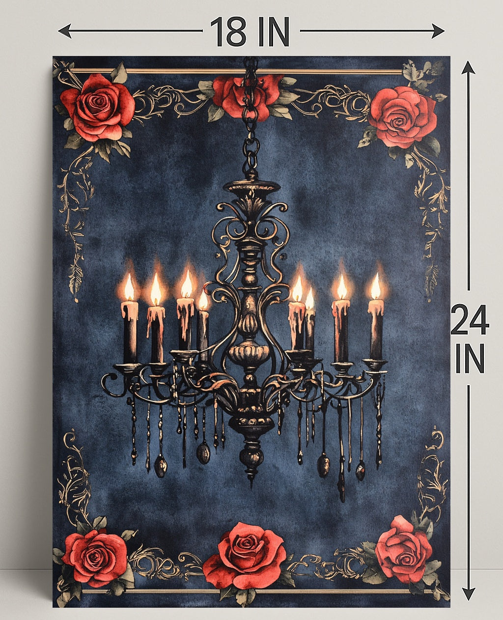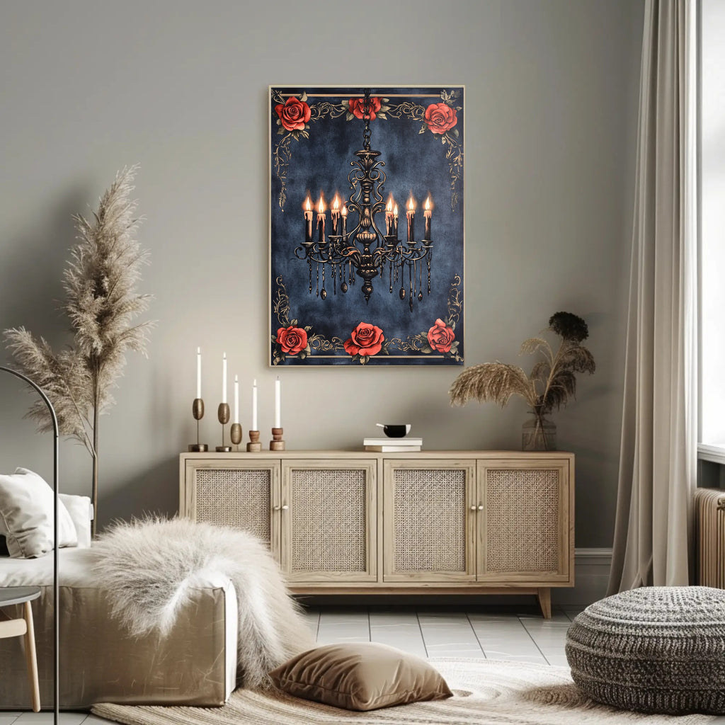 Bring a touch of timeless glamour to your walls with the Chandelier Elegance Poster from PosterGoat — a minimalist yet richly detailed art print that turns any room into an elegant vignette. This striking poster features an ornate, vintage chandelier with dripping candle wax and warm, flickering flames set against a deep navy textured background, framed by delicate gold filigree and vivid red roses for a dramatic, romantic finish.