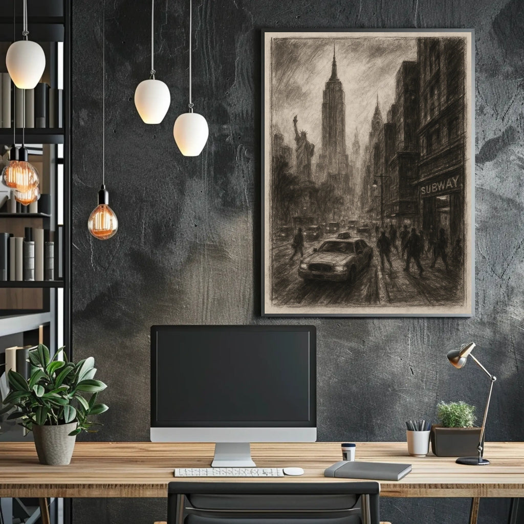 Immerse your space in timeless urban allure with this Charcoal Cityscape Poster. Rendered in a moody noir style, it captures a bustling New York scene anchored by the Statue of Liberty and a towering Empire State–like silhouette. The monochrome composition invites contemplation and pairs effortlessly with contemporary, vintage, or industrial decor.