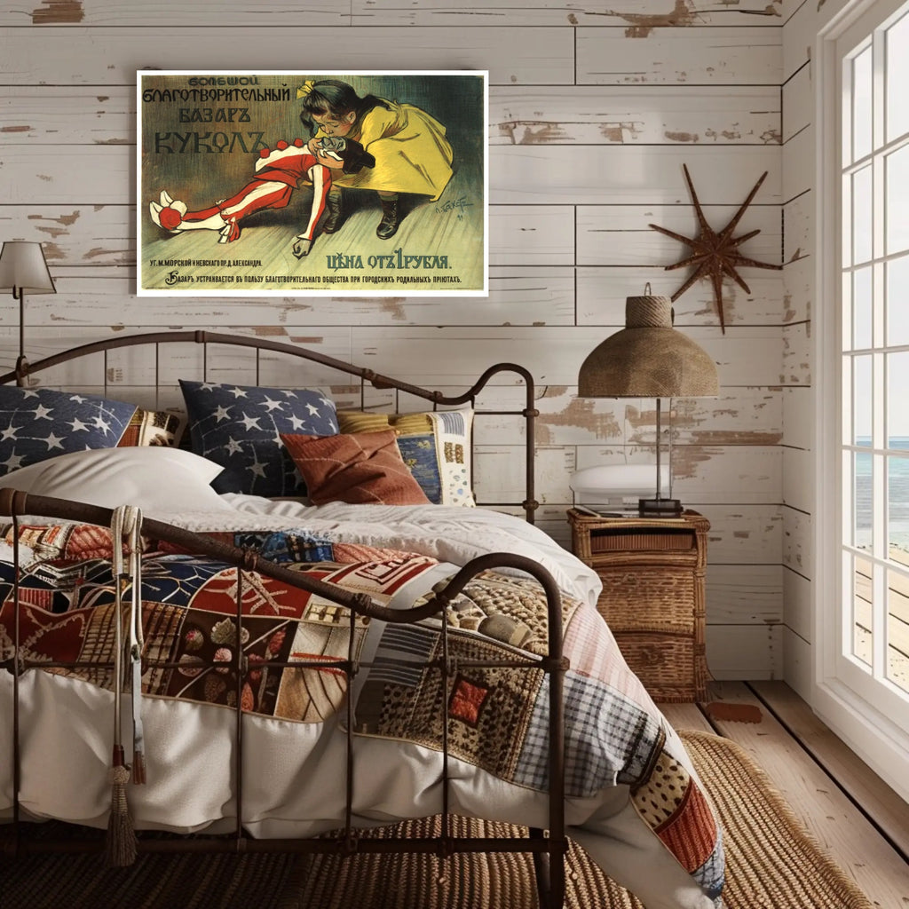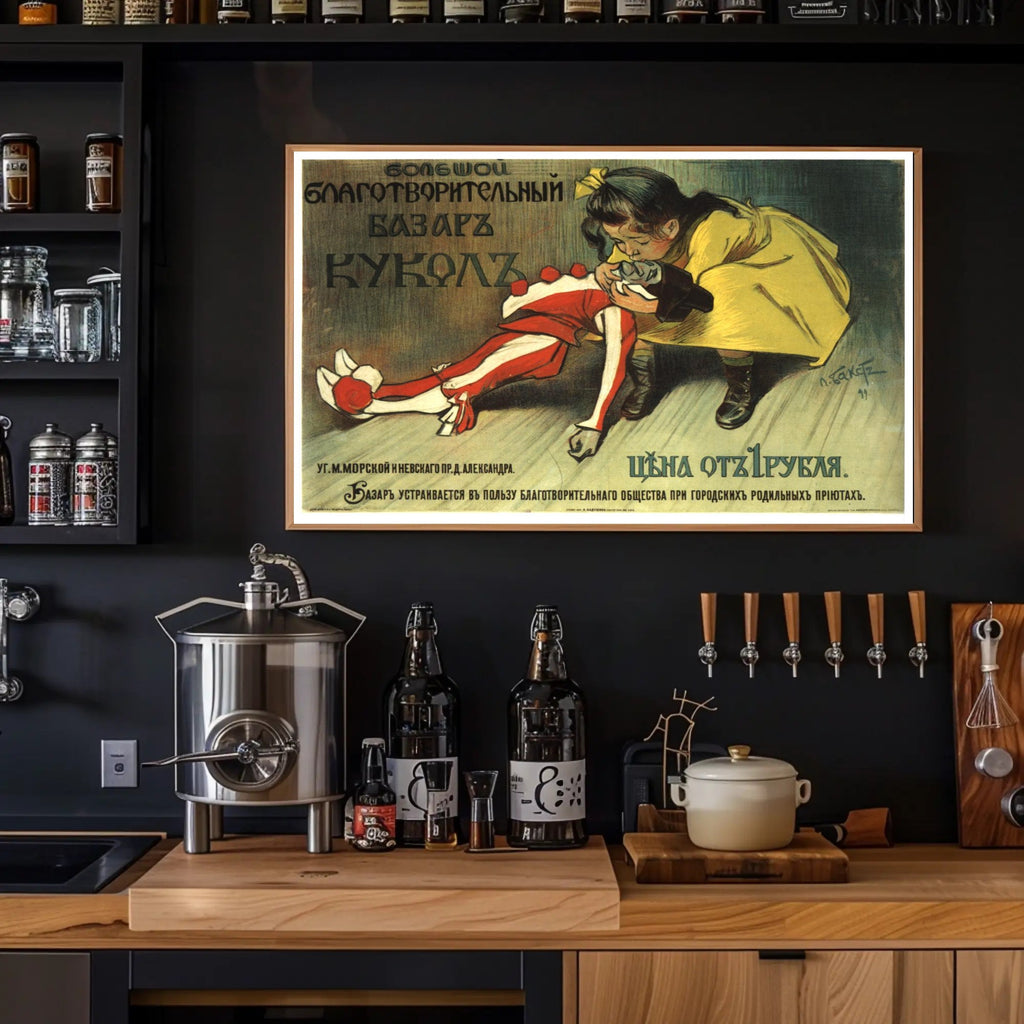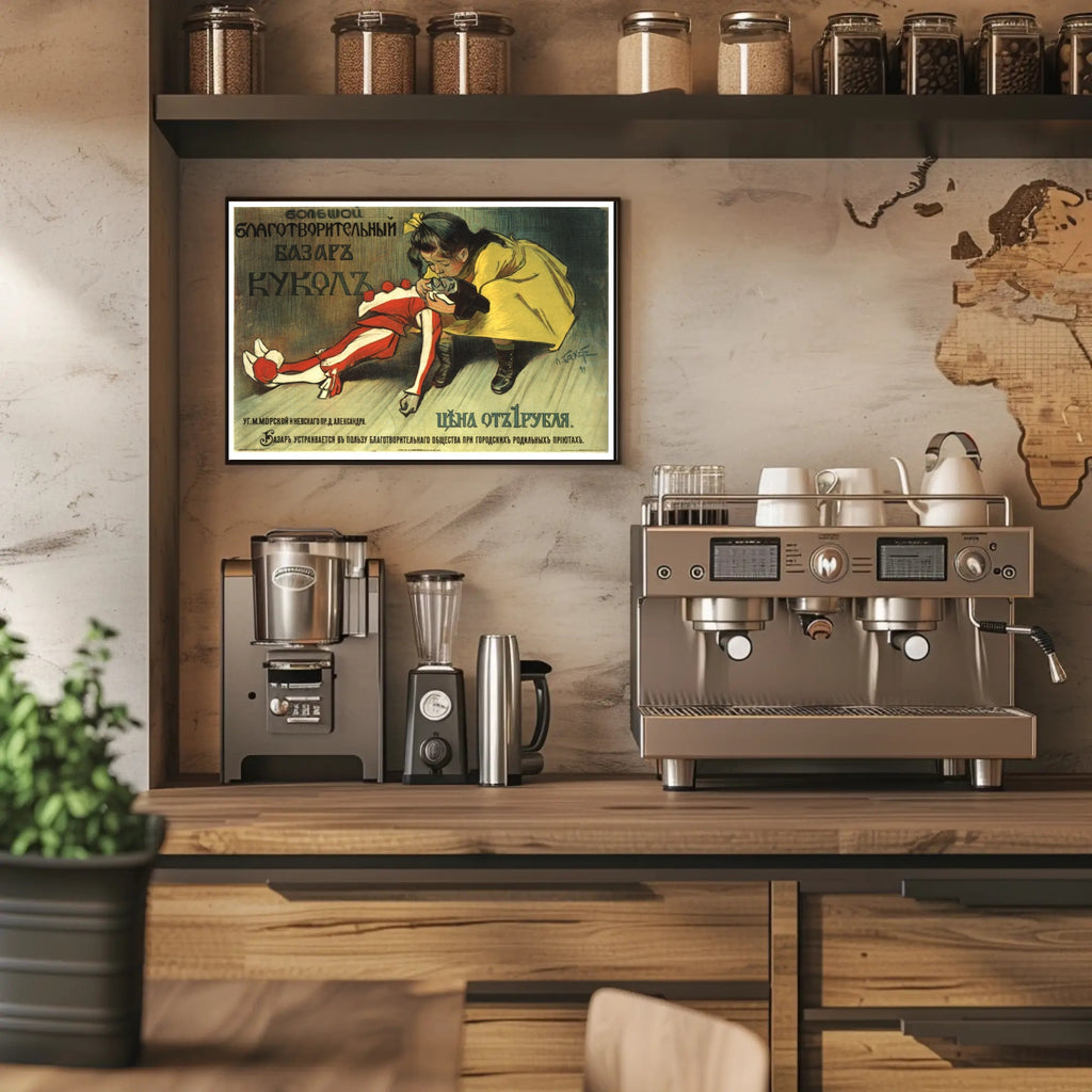 PosterGoat's "Charity Doll Bazaar" Poster — a vintage-inspired art print that brings nostalgia, storybook charm, and wanderlust energy to any room. This poster captures a tender scene: a little girl in a yellow coat cradling a classic red-and-white doll against a softly textured, muted background framed by bold Cyrillic lettering. The result is an evocative piece of wall art that feels both historic and warmly personal.