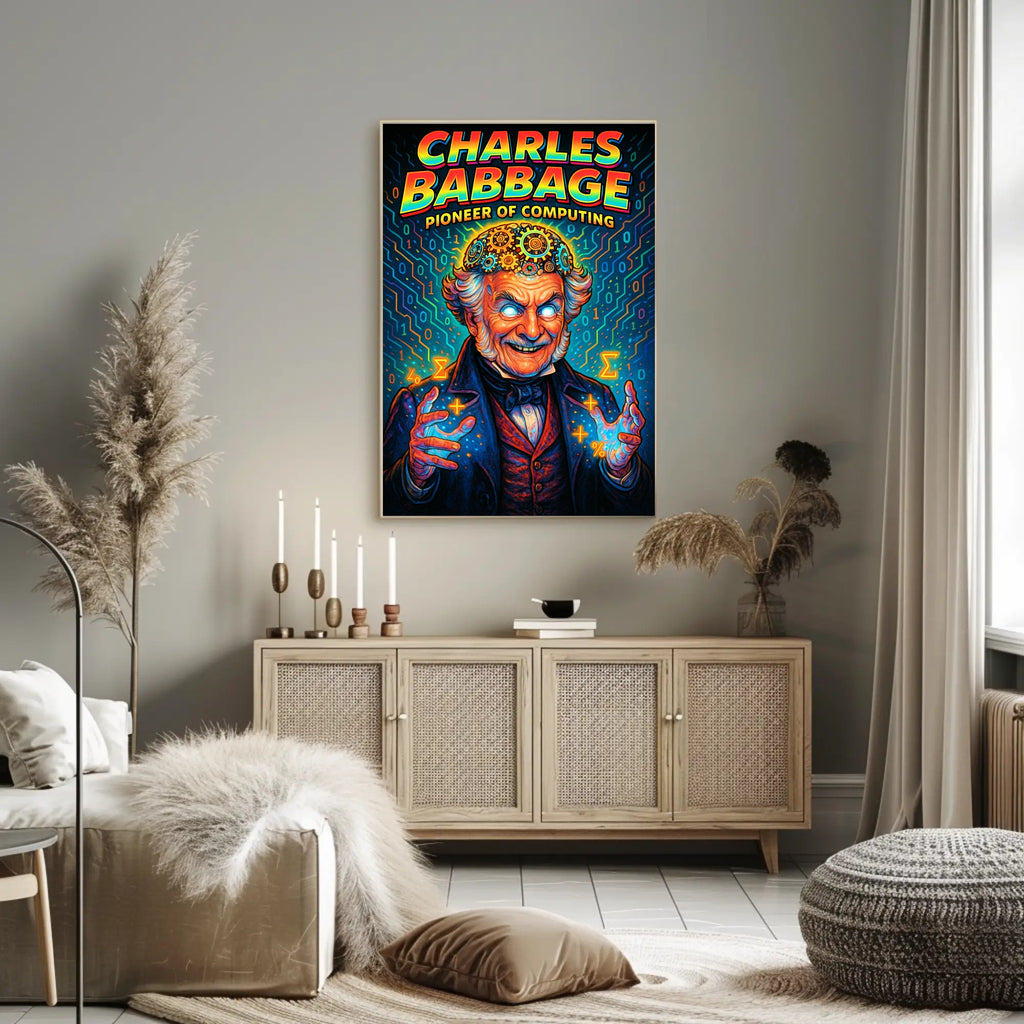 Charles Babbage — Pioneer of Computing from PosterGoat is a bold, museum-quality poster that celebrates the visionary behind modern computing with electrifying, retro-futuristic artwork. Vivid neon colors, glowing eyes, and a crown of interlocking gears capture both the genius and the mechanical spirit of Babbage in a striking minimalist-inspired composition.