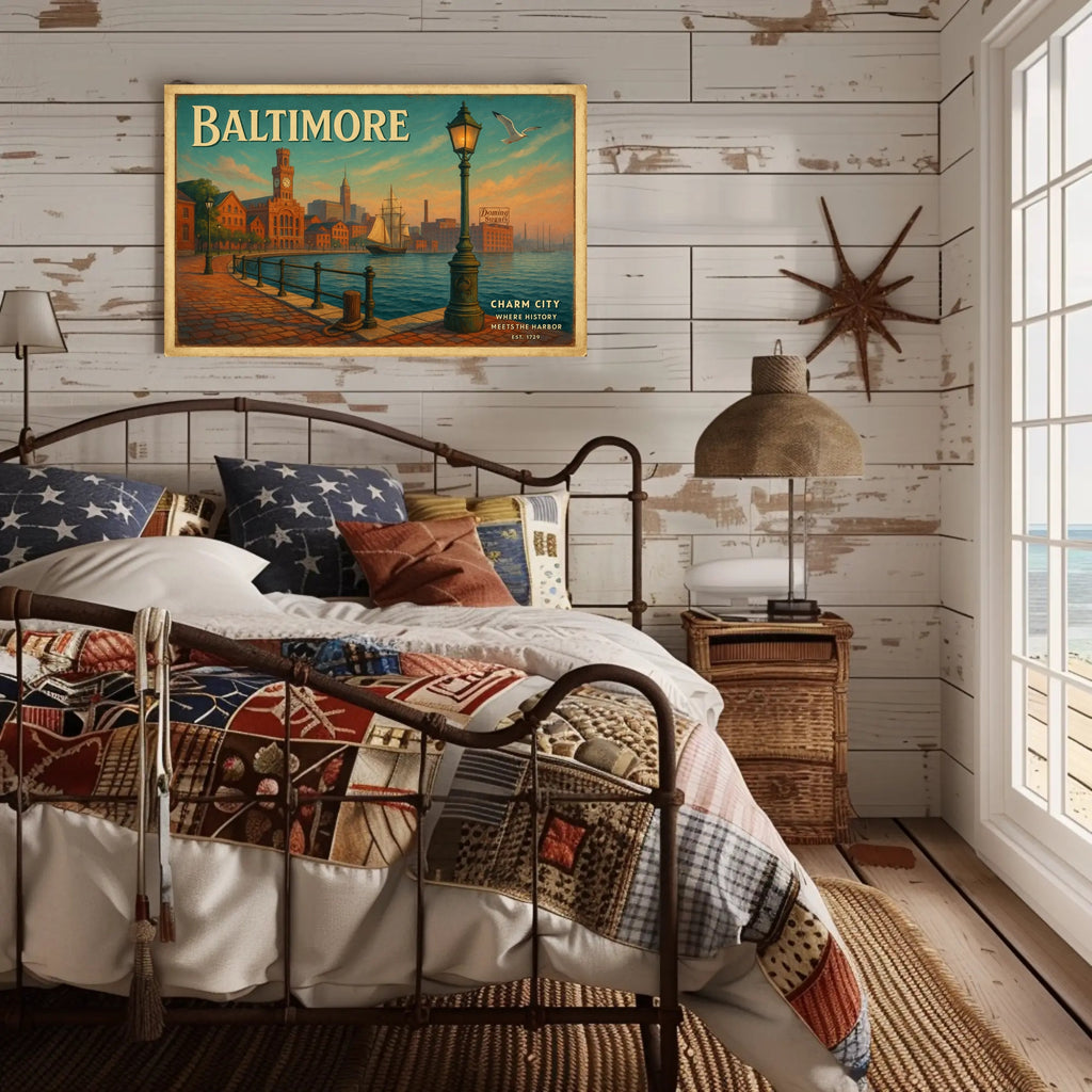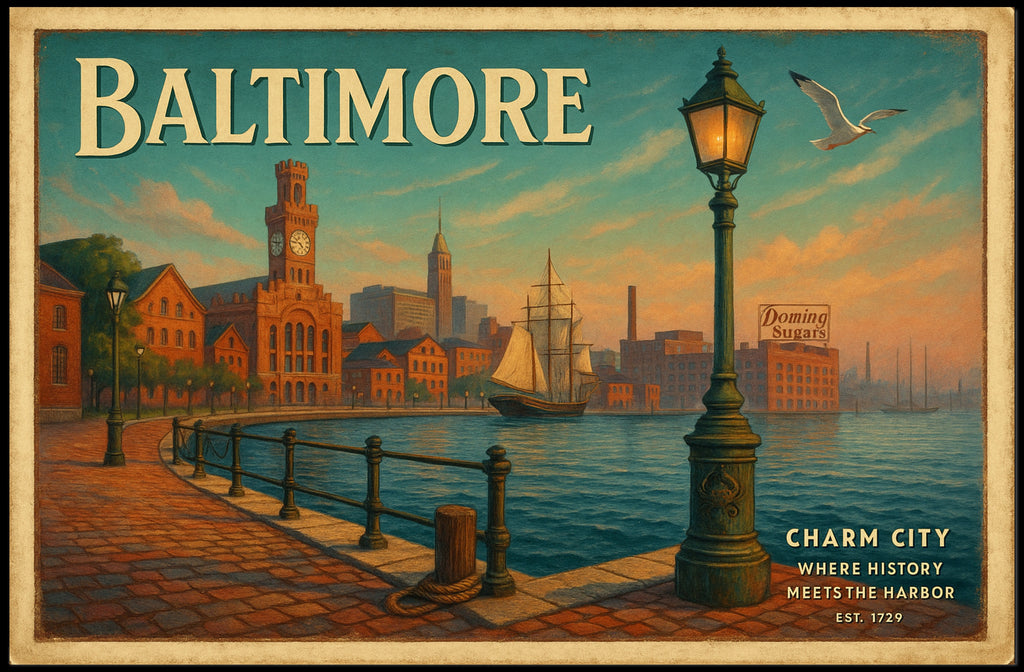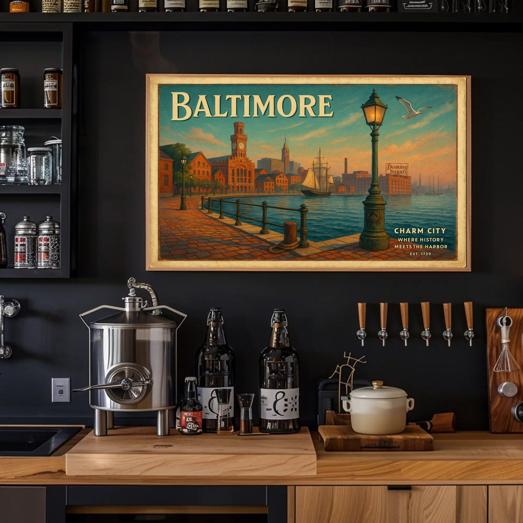 Charm City Harbor Travel Poster Art Print by PosterGoat captures the timeless beauty of Baltimore's waterfront in a vintage-inspired travel poster that feels both nostalgic and modern. Painted in warm sunrise hues, the scene features a cobblestone promenade, ornate lamppost, historic brick warehouses, and a graceful sailing ship — a perfect focal point for living rooms, home offices, cafes, or any space craving character.