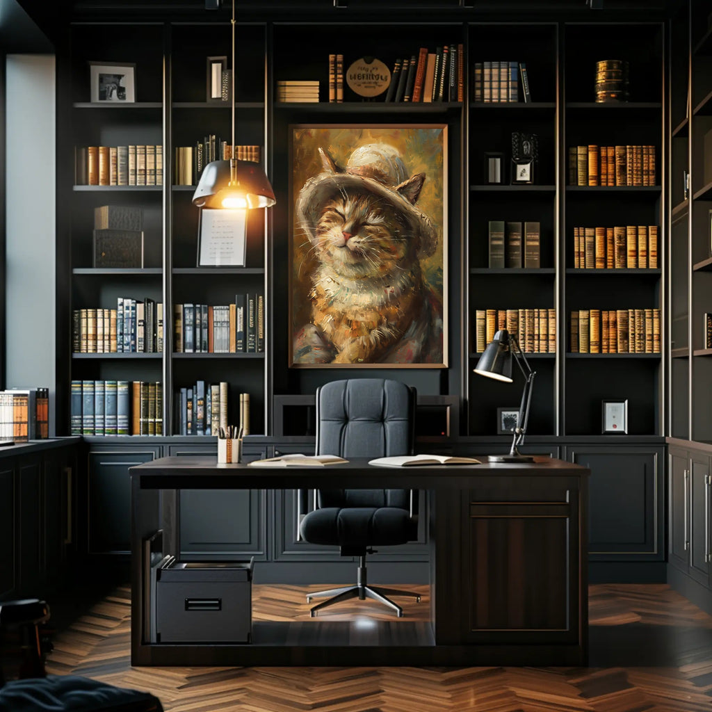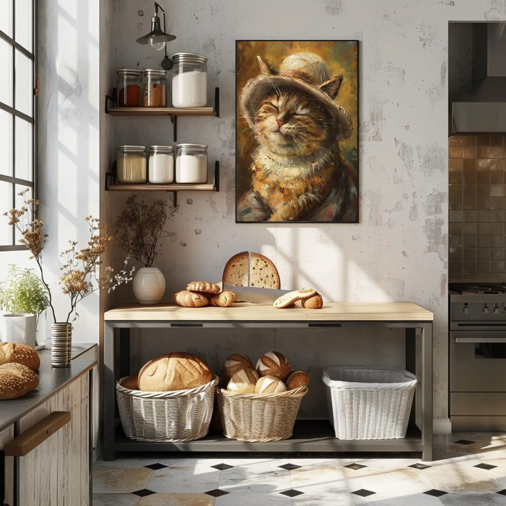 This enchanting poster showcases a delightful cat wearing an intricately woven hat, creating a whimsical and endearing scene. The cat, with its closed eyes and serene expression, evokes a sense of peace and tranquility. The impressionistic artistic style employs bold brushstrokes and a warm color palette featuring shades of brown, orange, and cream. These elements combine to enhance the poster's calming and whimsical theme. Perfect for cat lovers and art enthusiasts alike, this poster adds a touch of charm and warmth to any space, making it a cherished addition to any collection.