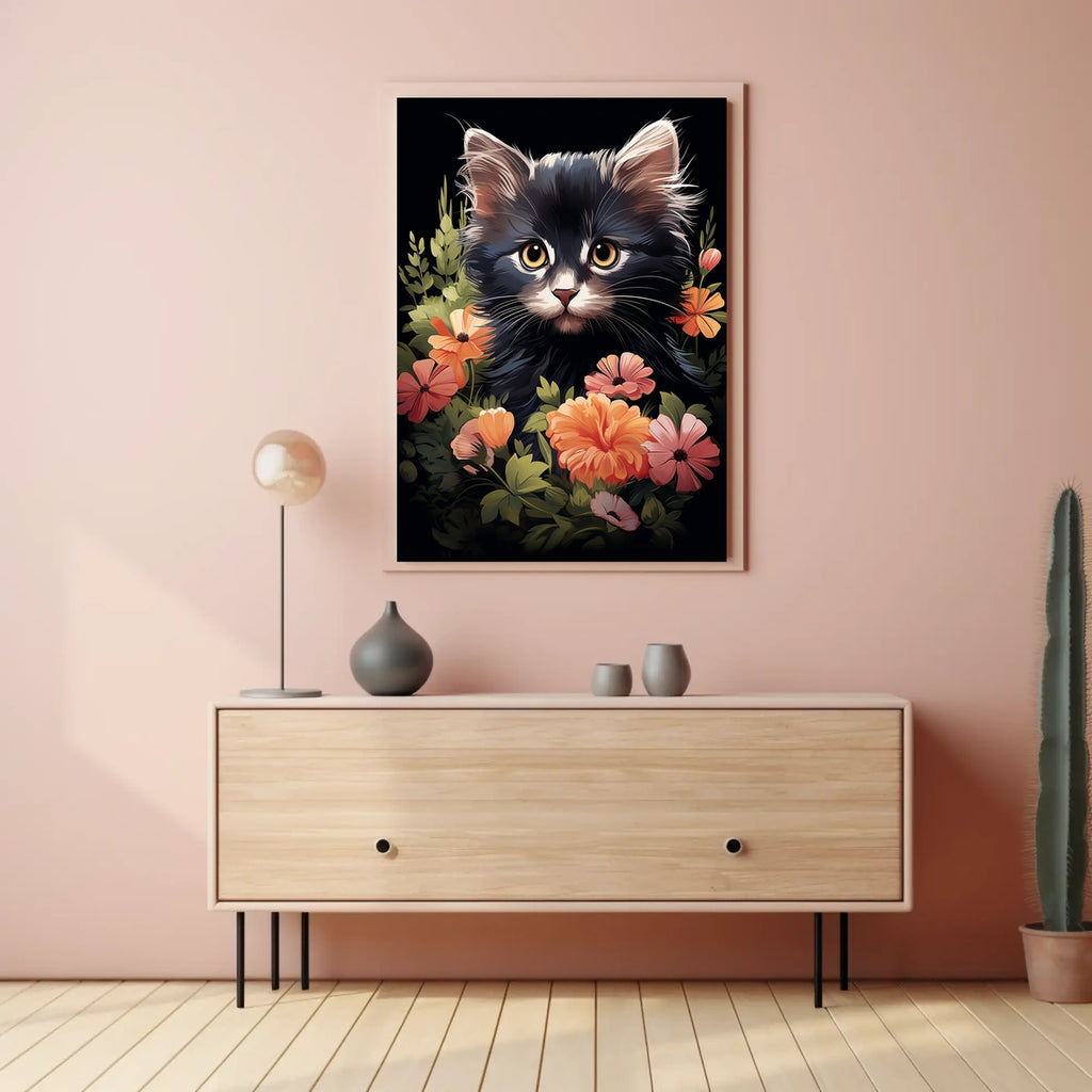 Enhance your home decor with this charming wall art—a delightful addition to living rooms, nurseries, bedrooms, or offices that celebrates the timeless appeal of a playful kitten and lush florals.