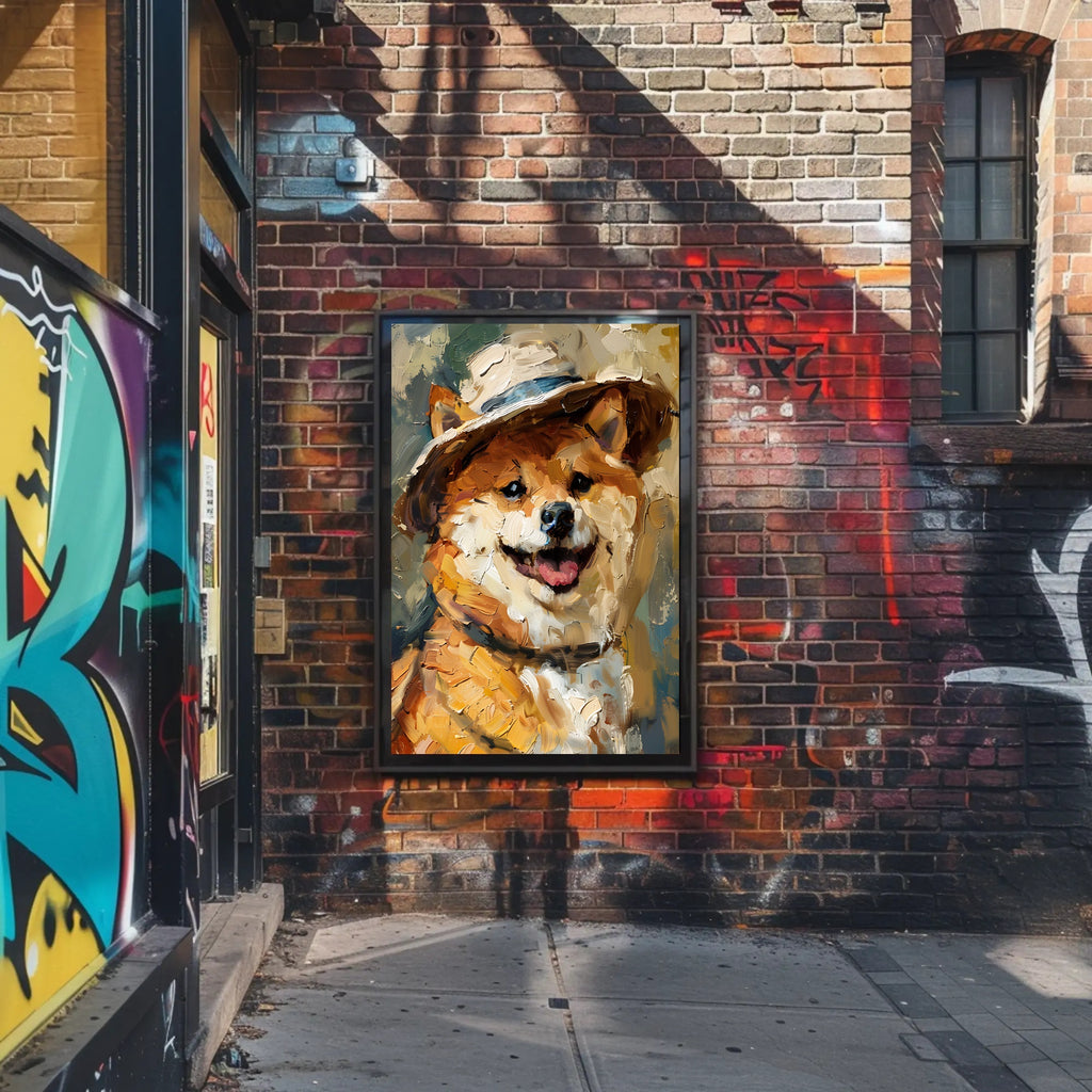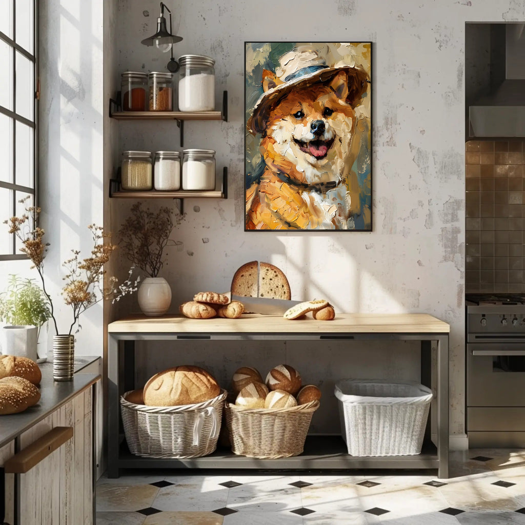 Delight your space with a lively and cheerful artistic depiction featuring a charming Shiba Inu as the central character. This playful artwork captures the adorable dog wearing a stylish hat, exuding a personable and spirited vibe. The dog's joyful expression, with its mouth open in a display of happiness, enriches the composition, making it ideal for dog lovers and art enthusiasts alike. Its artistic style combines whimsy with charm, making it a distinctive decorative piece that brings joy and personality to any environment, whether at home or in the office.