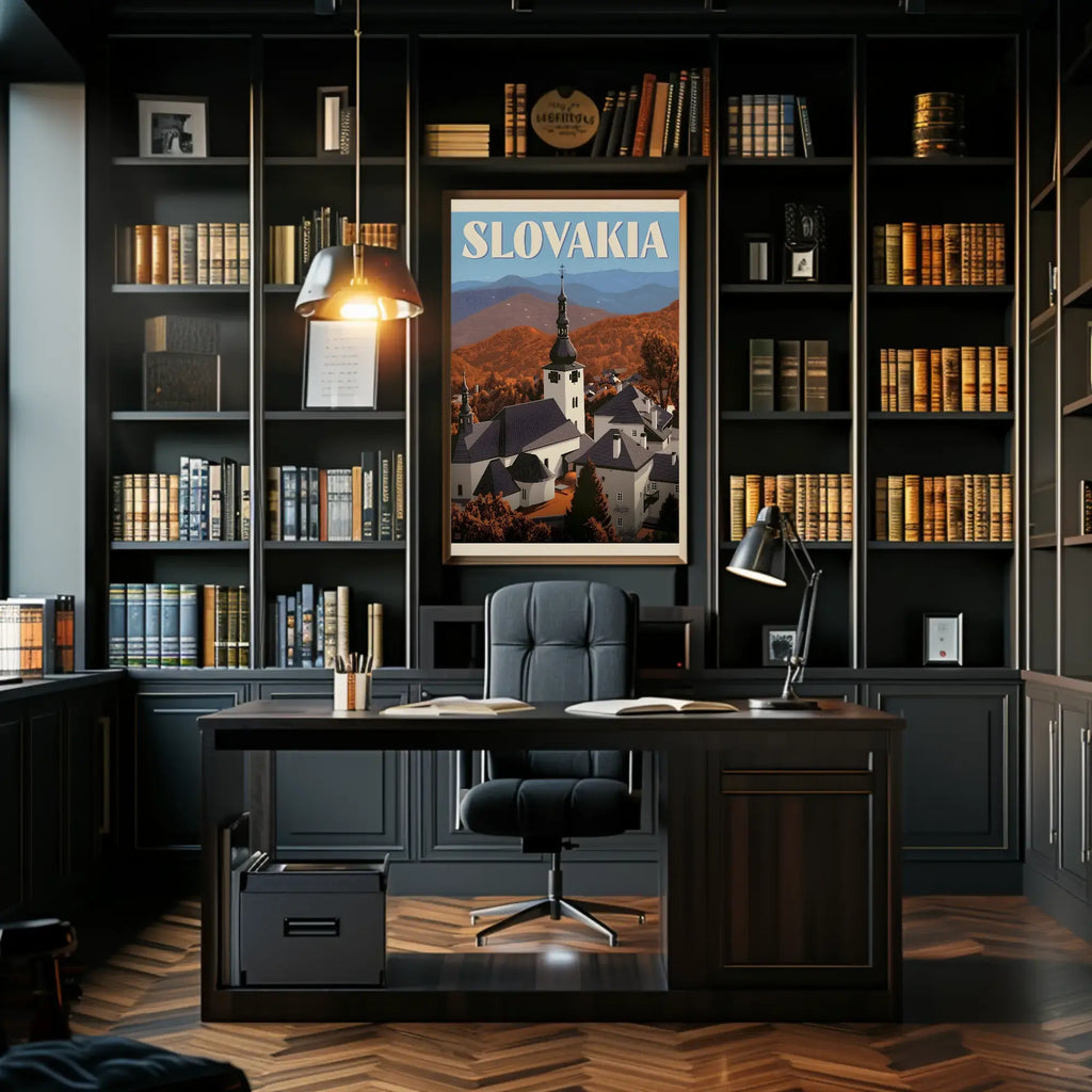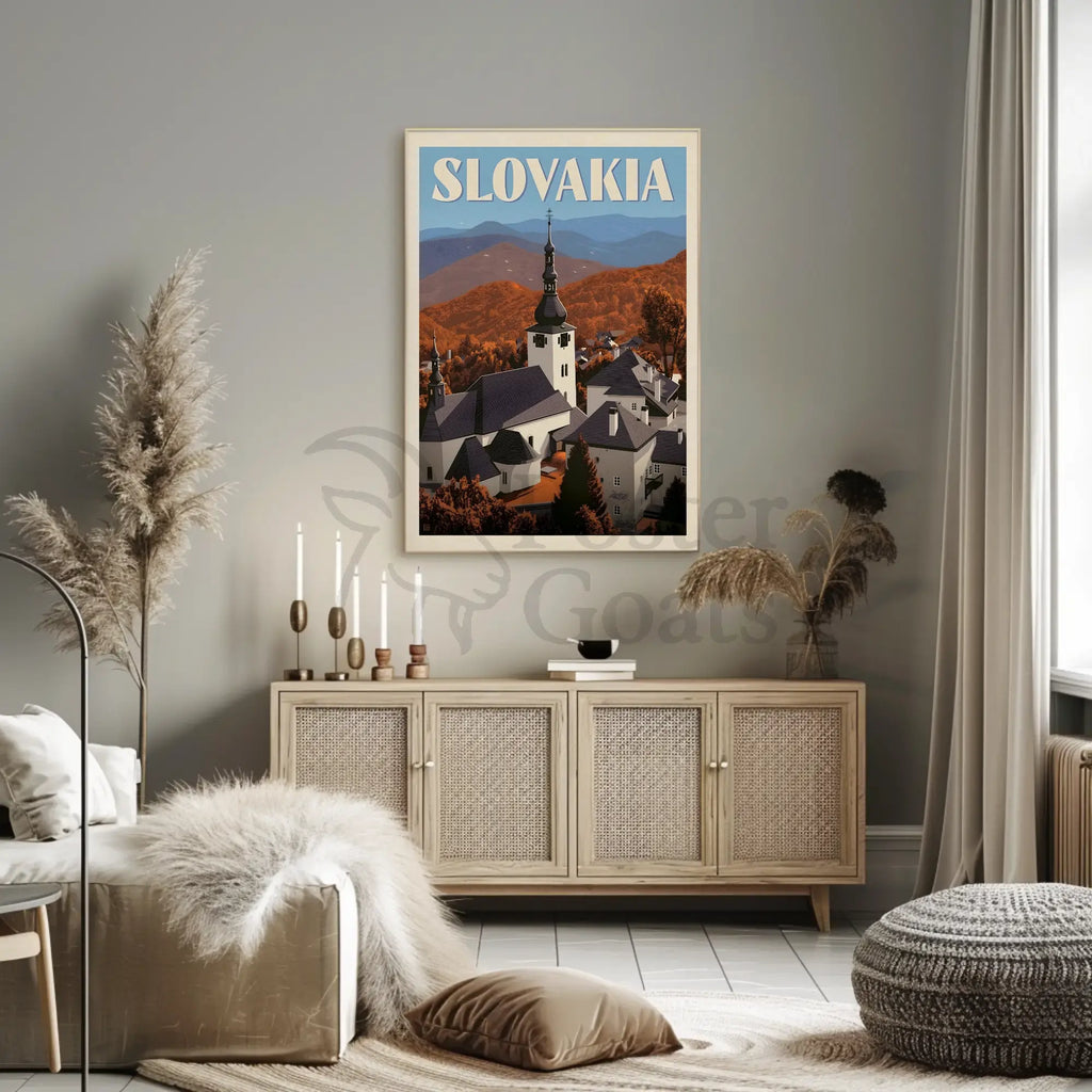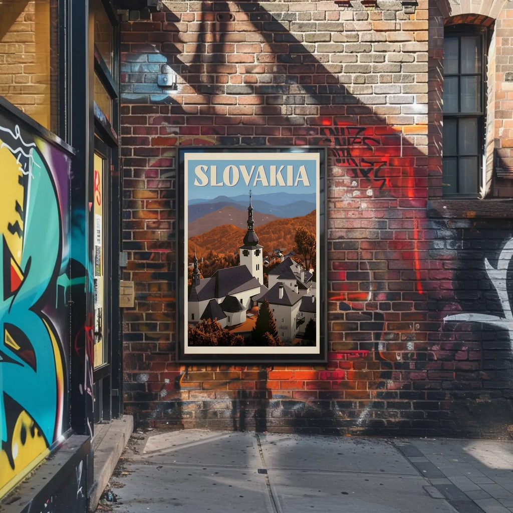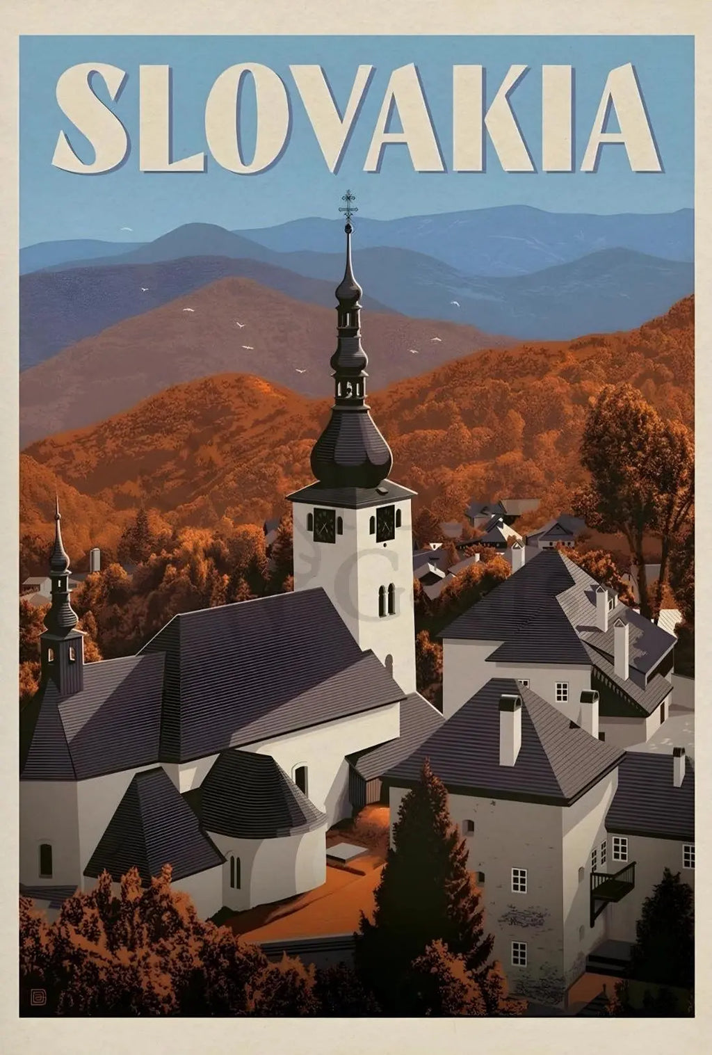 Immerse yourself in the breathtaking charm of Slovakia with this beautiful vintage poster. Showcasing a picturesque Slovak village, it captures the essence of traditional European architecture with its iconic church spire and rustic buildings. The serene backdrop of rolling hills and mountains highlights Slovakia’s diverse landscapes. This poster, with its warm autumnal tones and classic travel style, evokes a sense of nostalgia and appreciation for the country's cultural and natural beauty. Perfect for travel enthusiasts and history buffs, it’s a striking piece that brings historical richness and tranquility to any space.