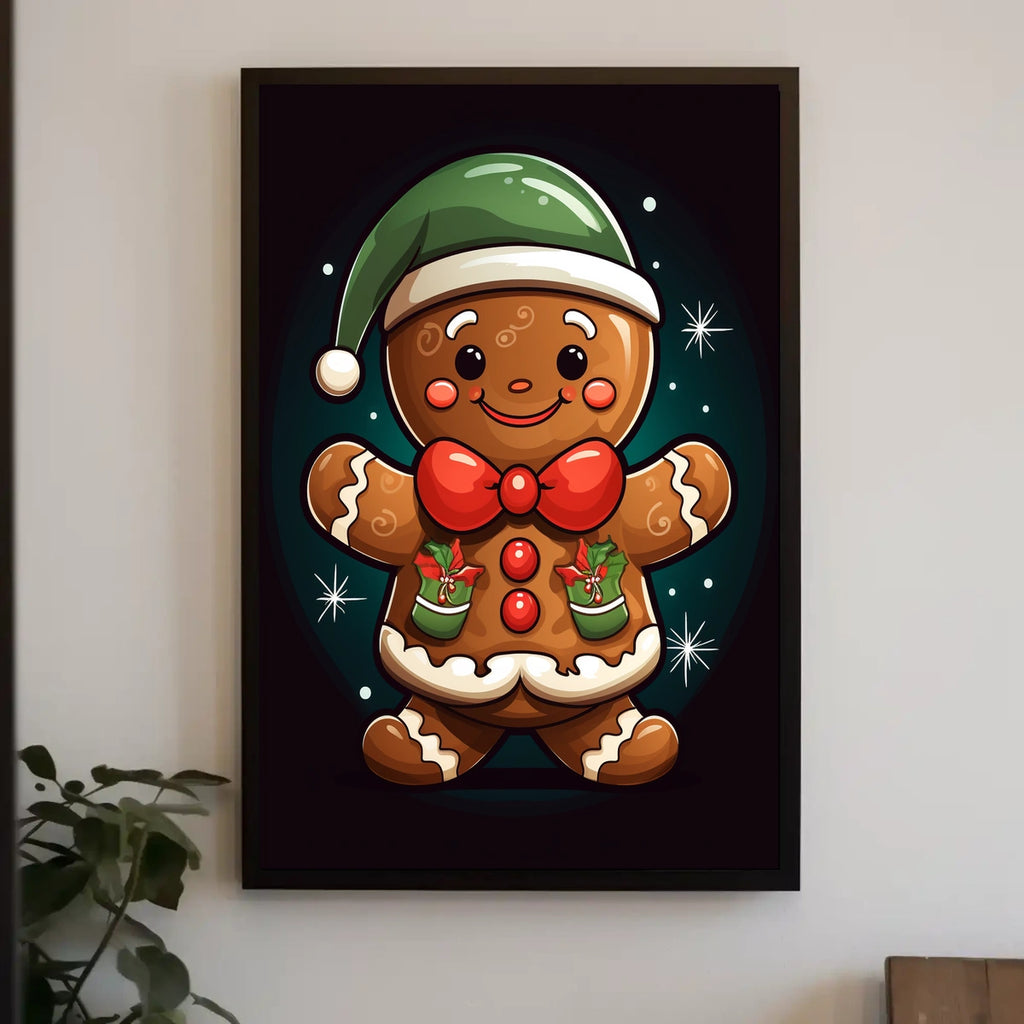 Celebrate the festive season with the Cheerful Gingerbread Elf Holiday Poster for Christmas, a timeless wall art piece designed to brighten any space. Set against a dark backdrop sprinkled with white snowflakes, this artwork captures the whimsy and warmth of a winter wonderland. The bright, colorful, cartoonish style brings the gingerbread figure to life, featuring a green elf-like hat, a striking red bowtie, and intricate icing patterns. Two charming gift pouches adorned with holly add a final touch of holiday cheer. Whether you're decorating your home, classroom, or office, this poster is sure to delight collectors, families, and anyone who loves the magic of Christmas.