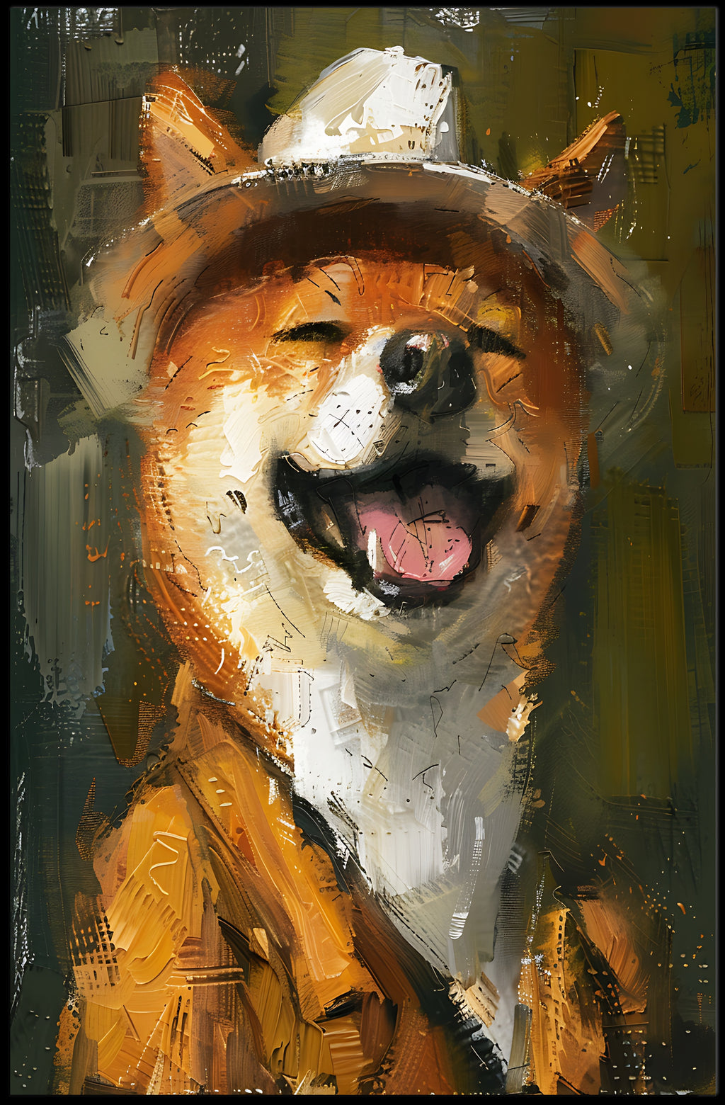 This whimsical animal poster captures a joyous Shiba Inu in an anthropomorphic style, wearing a light-colored fedora and a classic suit jacket. The dog's laughing expression adds a humorous and endearing touch to the composition. Created in a painterly, impressionistic style, this artwork uses soft brushstrokes and vibrant colors to convey a sense of lightheartedness and artistic flair. Perfect for dog lovers and art enthusiasts alike, this poster brings charm and character to any space, making it ideal for brightening a room or adding personality to an art collection.