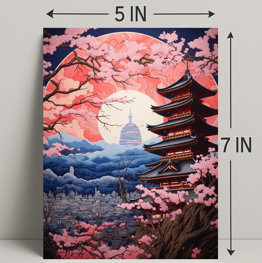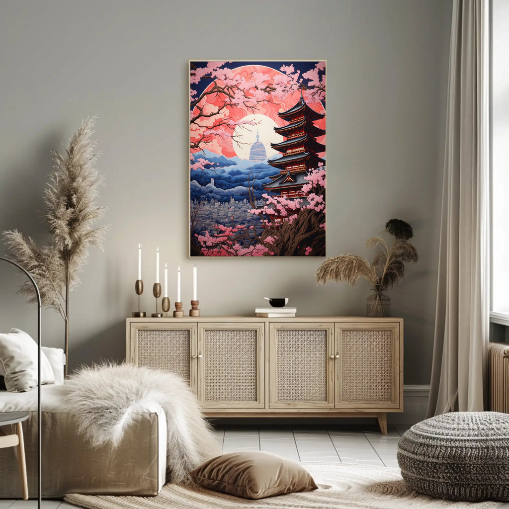 Captivating composition: Elegant pagoda framed by blooming cherry branches and a marbled sun—perfect for adding depth and atmosphere to living rooms, bedrooms, or office spaces.