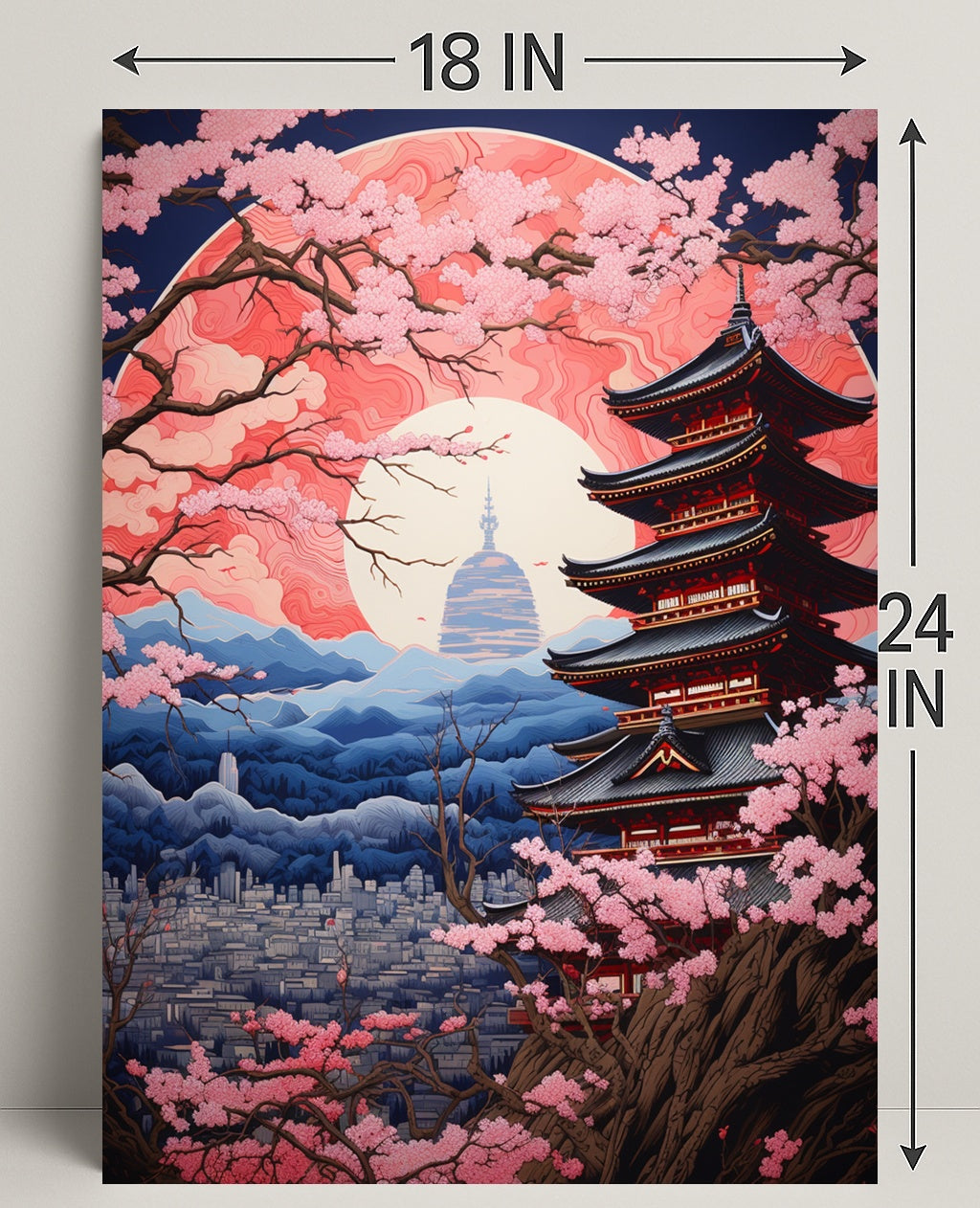 The print’s bold navy and coral palette balances calm and energy—soft pink blooms against deep indigo mountains create an instant focal point while maintaining a soothing presence. Fine-lined details in the pagoda and cityscape reward up-close viewing, while the overall silhouette reads beautifully from across the room.