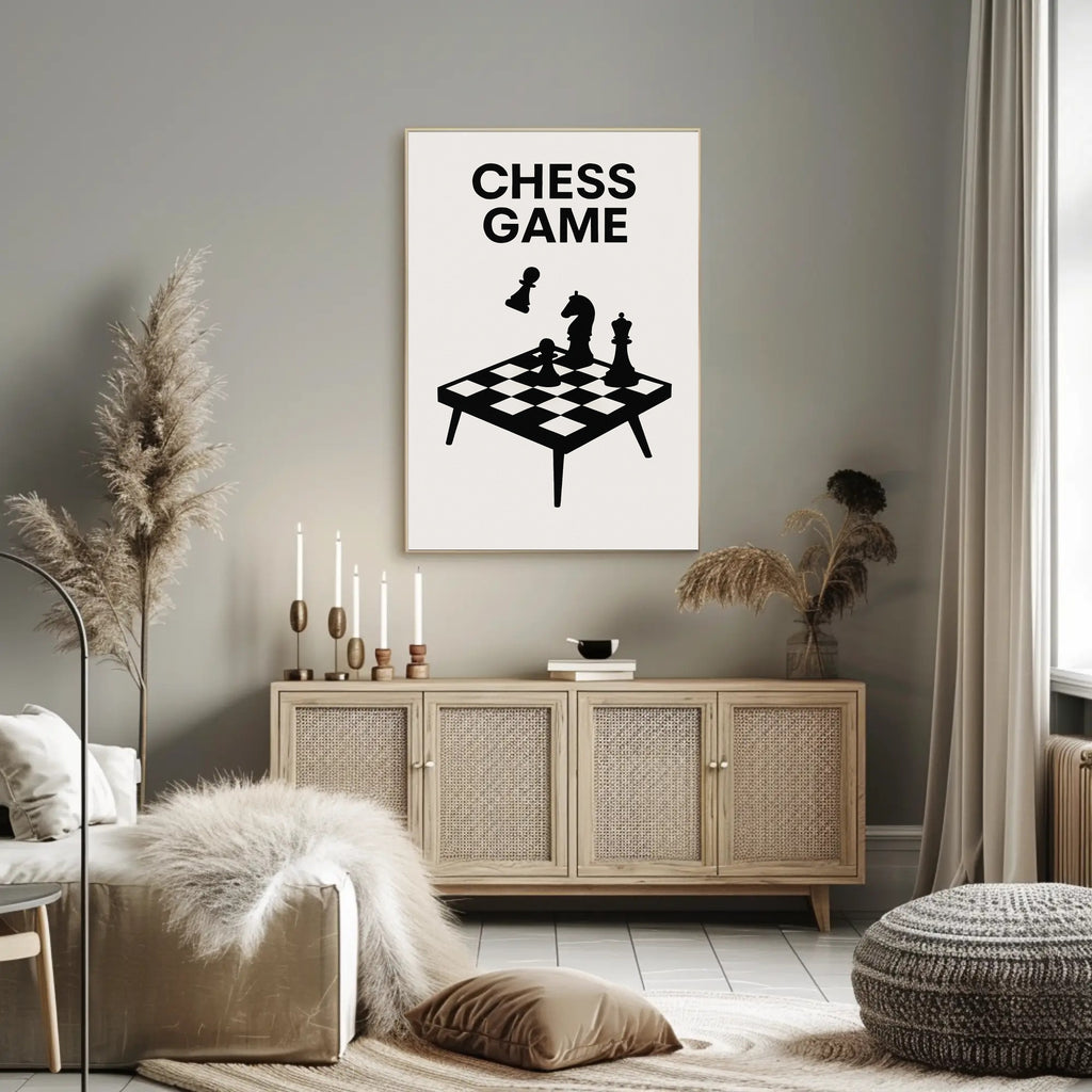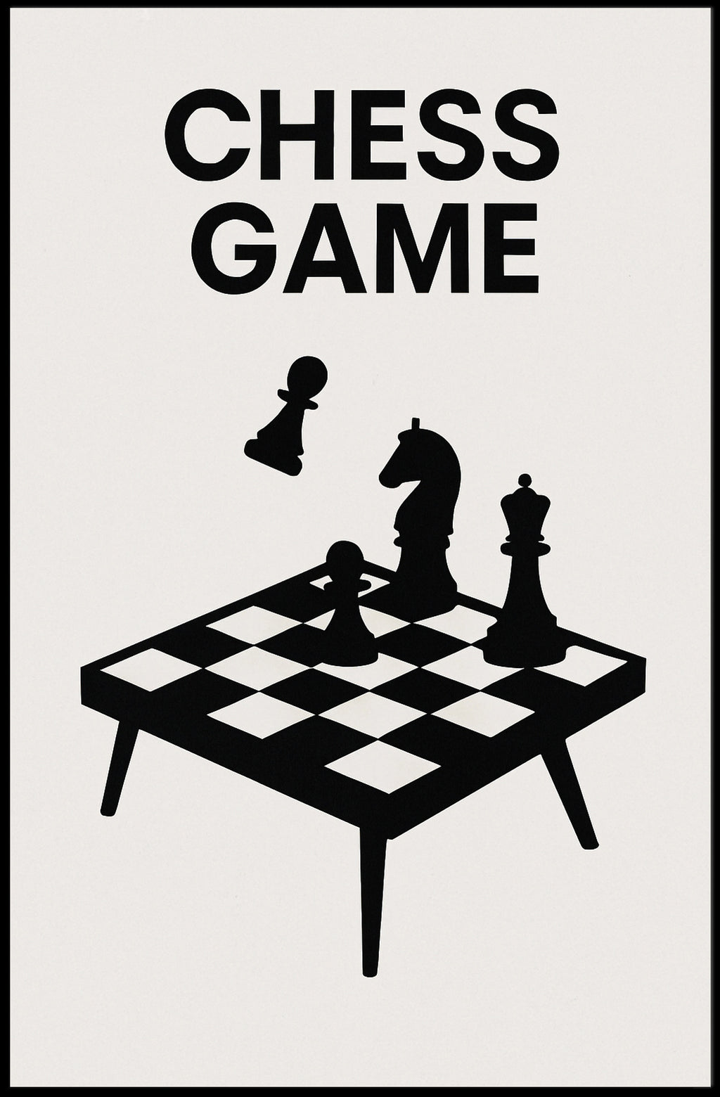 Chess Game Poster by PosterGoat — a striking minimalist art print that brings the strategic elegance of chess into your home decor. This black-and-white poster features bold typography and a playful, mid-century style chessboard and pieces illustration that commands attention while keeping a clean, modern aesthetic.
