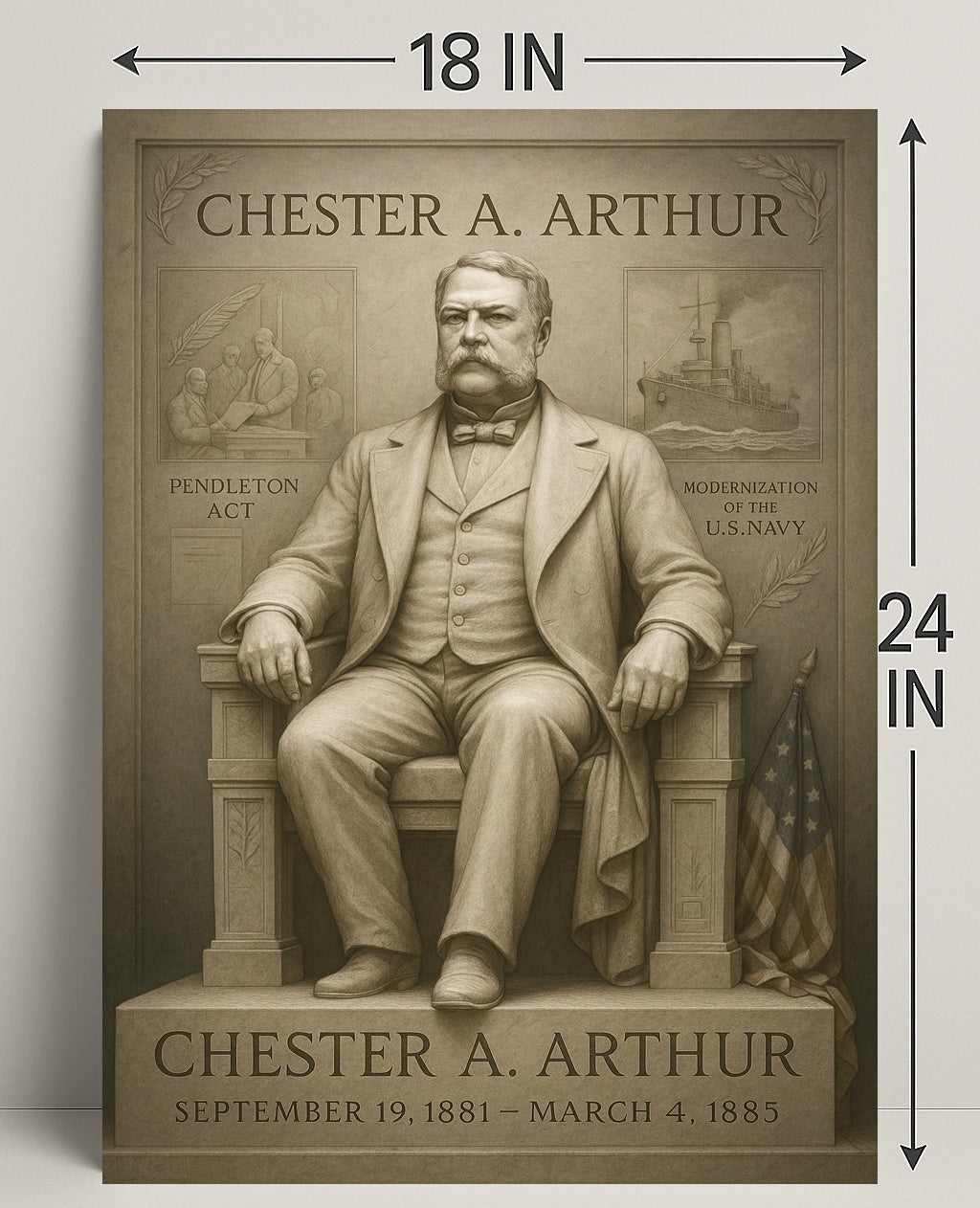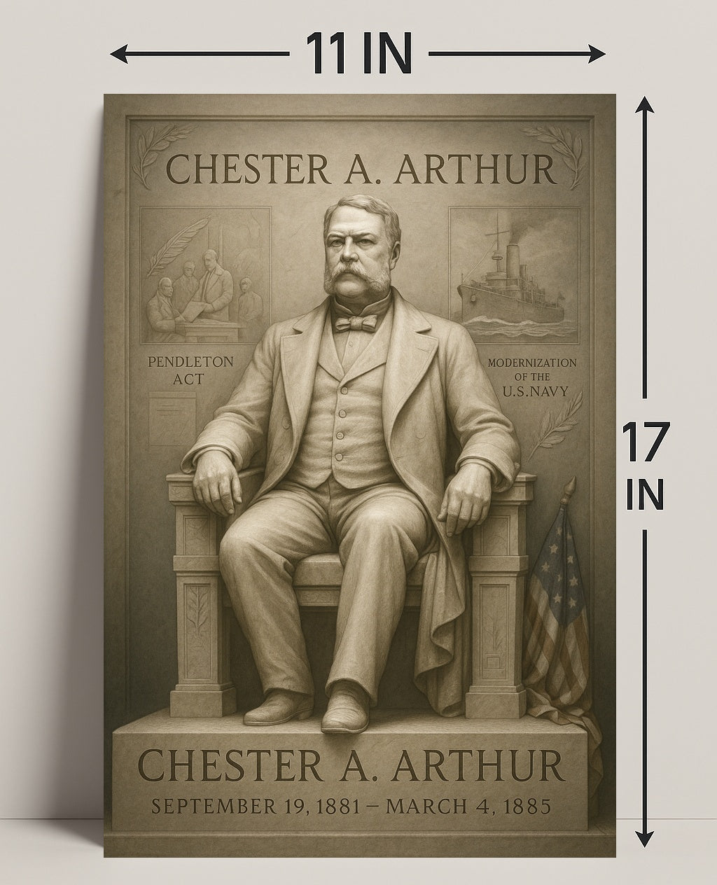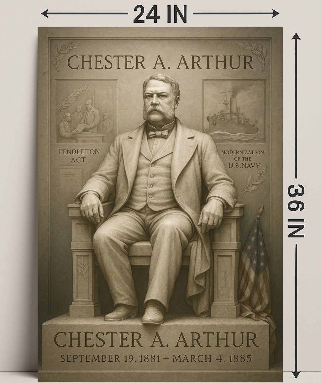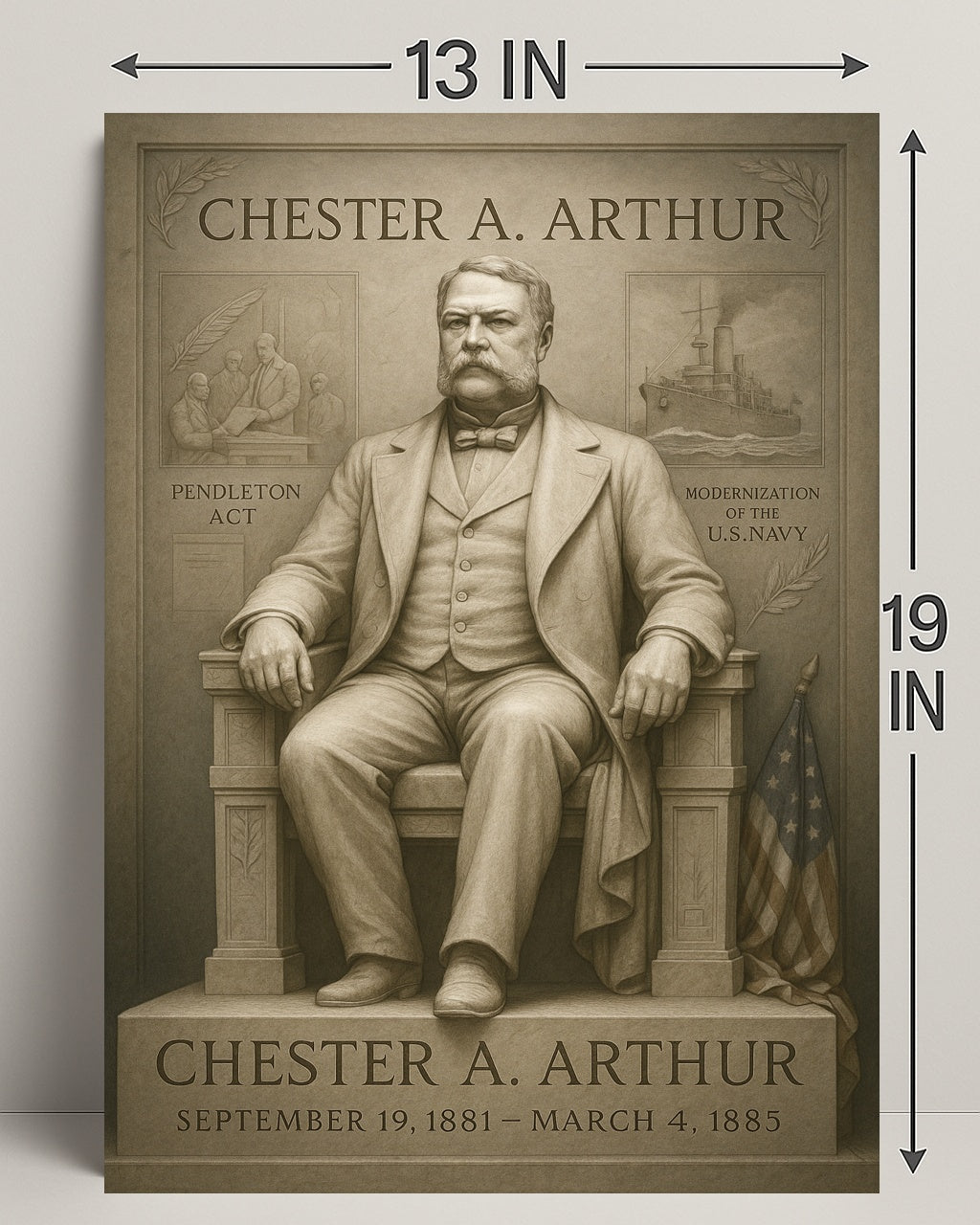 Celebrate American history with the Chester A. Arthur 21st President Poster from PosterGoat — a museum-quality wall art print that combines classical portraiture with vintage sepia tones to create a commanding focal point for any home, office, or study. The design reproduces a statue-like likeness of President Arthur seated in a dignified pose, framed by subtle vignettes referencing the Pendleton Act and the modernization of the U.S. Navy, plus engraved dates beneath his name for an authentic commemorative feel.