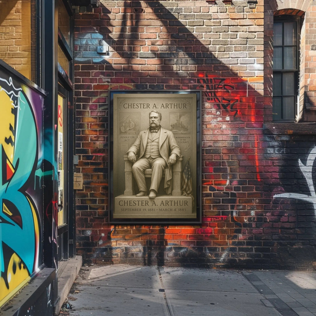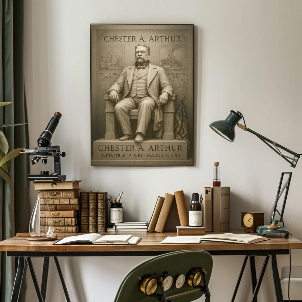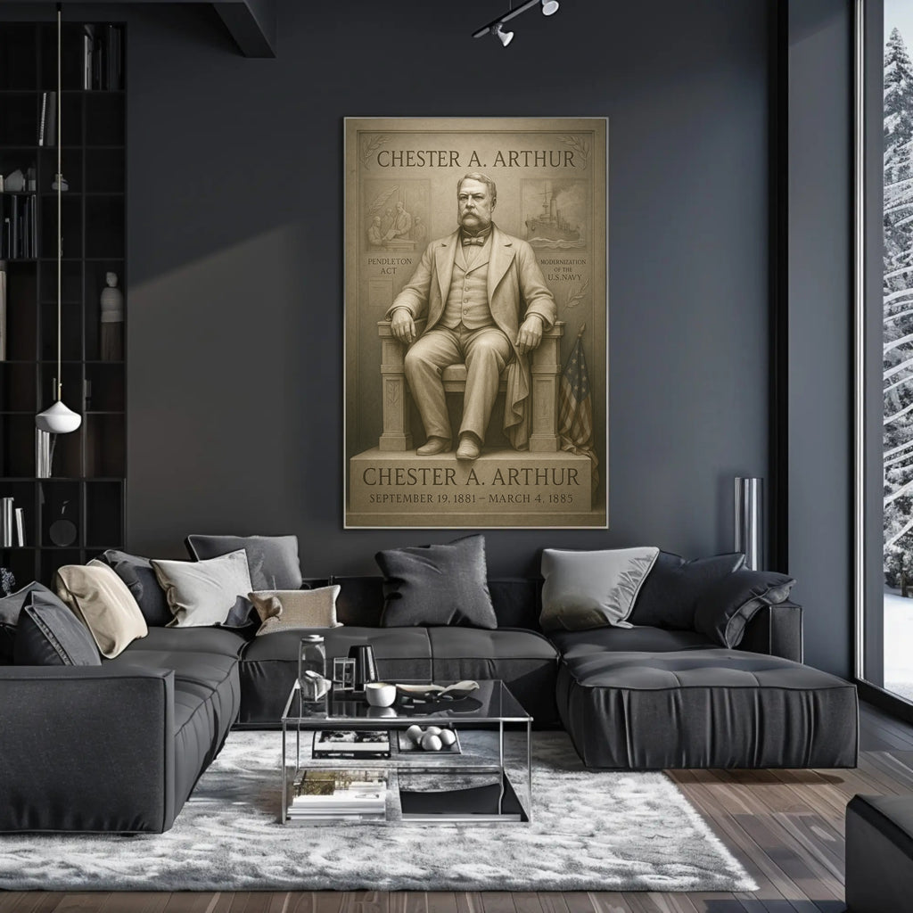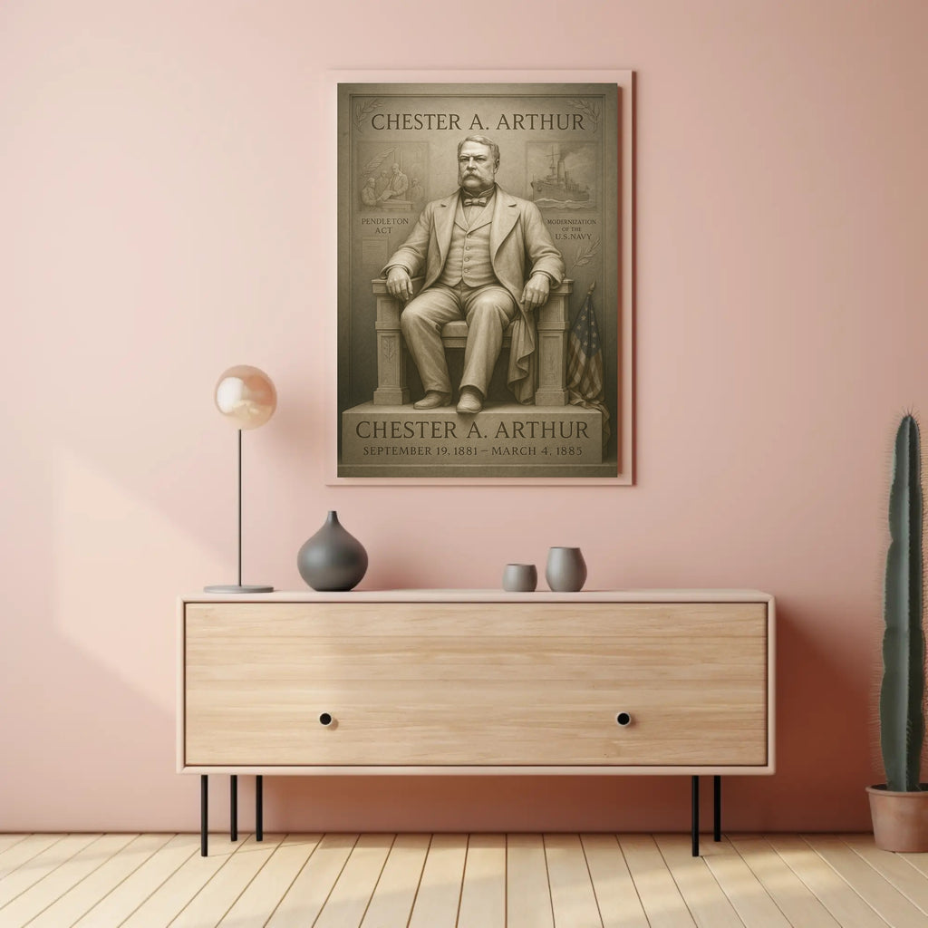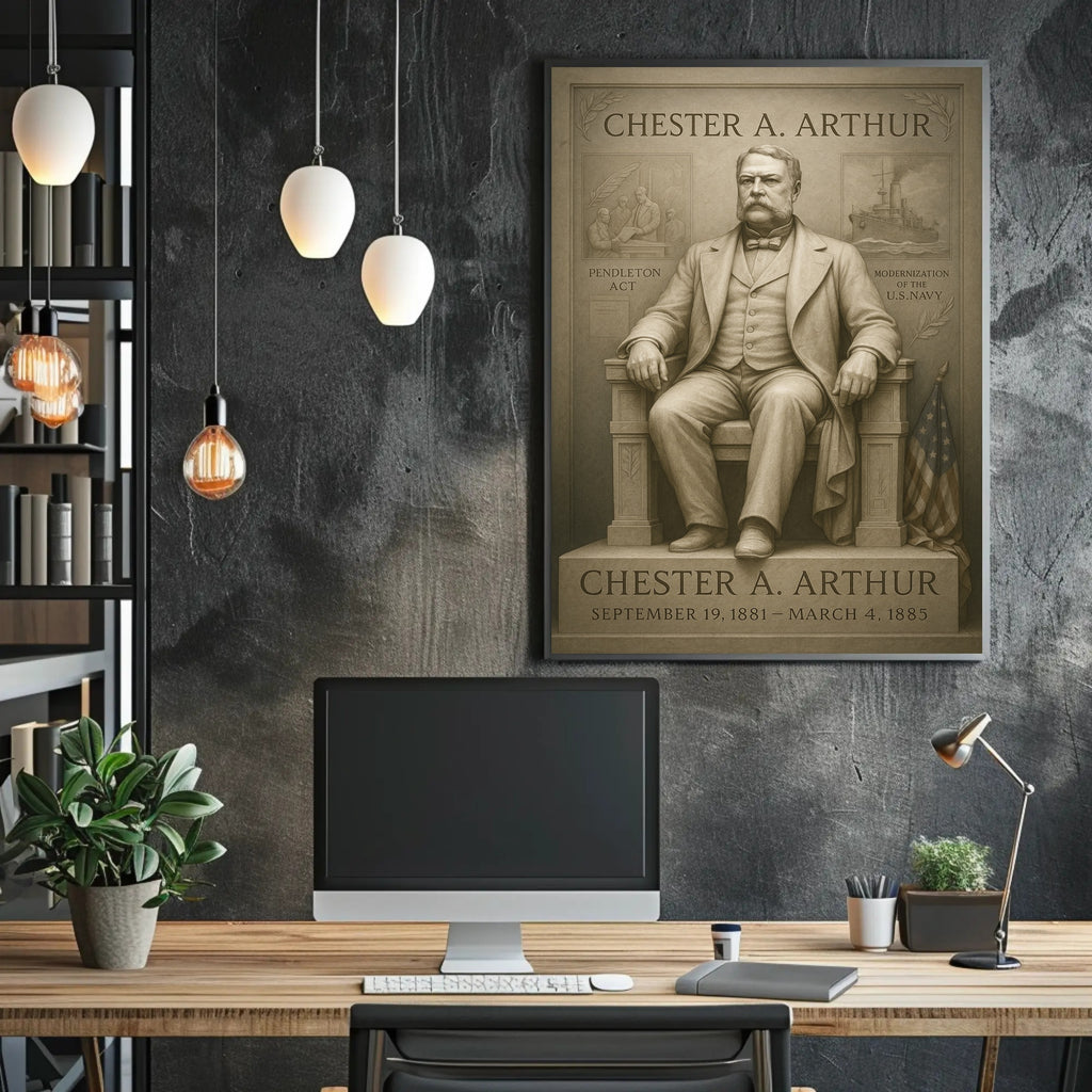 Celebrate American history with the Chester A. Arthur 21st President Poster from PosterGoat — a museum-quality wall art print that combines classical portraiture with vintage sepia tones to create a commanding focal point for any home, office, or study. The design reproduces a statue-like likeness of President Arthur seated in a dignified pose, framed by subtle vignettes referencing the Pendleton Act and the modernization of the U.S. Navy, plus engraved dates beneath his name for an authentic commemorative feel.