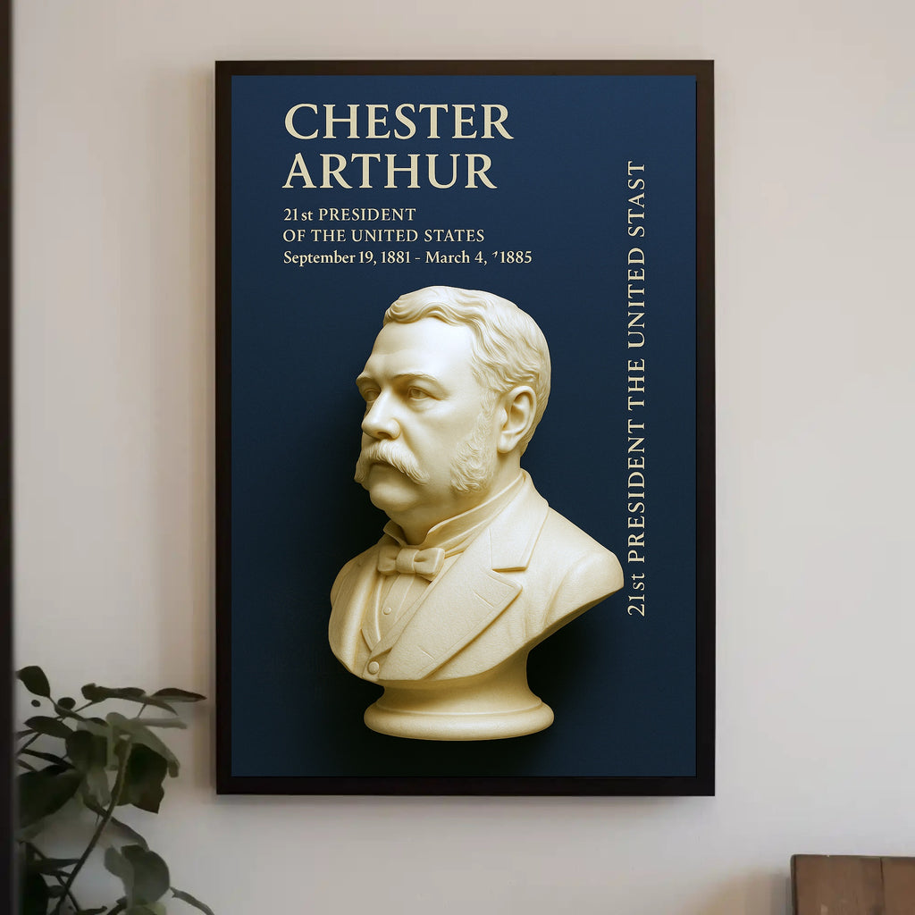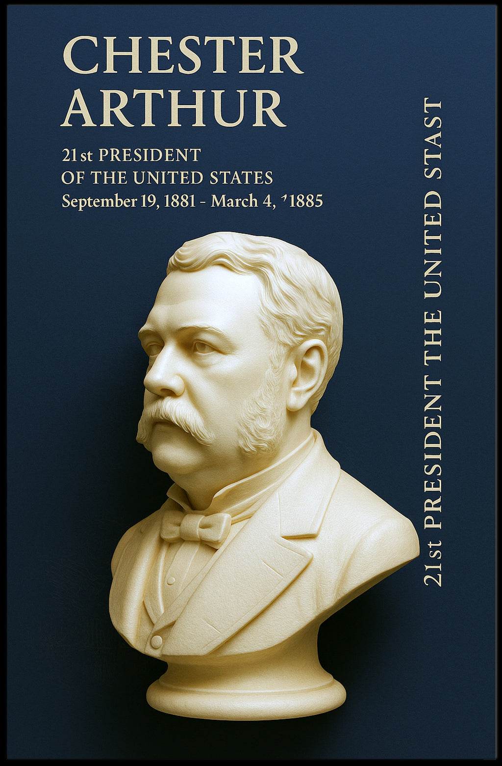 - Elegant, museum-style design: Photorealistic sculpture rendering of Chester Arthur set against a rich navy field, creating dramatic contrast and depth.
