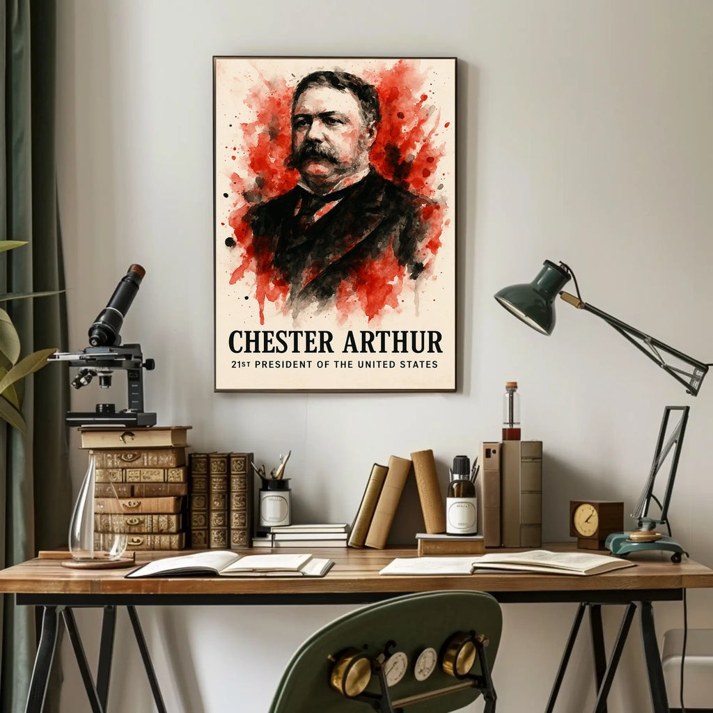 Chester Arthur Watercolor Portrait Historical-Presidential Poster celebrates the beauty of this iconic figure with a timeless wall art piece designed to capture his dignified presence. Immerse yourself in the vibrant world of late-19th-century America with this stunning watercolor portrait of Chester Arthur, the 21st President of the United States. The artistic style captures a textured and fluid appearance, breathing life into Arthur's dignified presence. Perfect for history enthusiasts, educators, or those looking to add a sophisticated touch to their office or study, this high-quality poster blends history and art seamlessly. Its unique aesthetic brings personality and depth, evoking the era's elegance and transformative milestones. Elevate your decor with this exquisite piece celebrating a pivotal figure in American leadership.