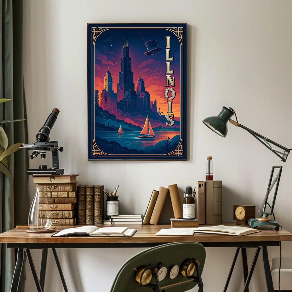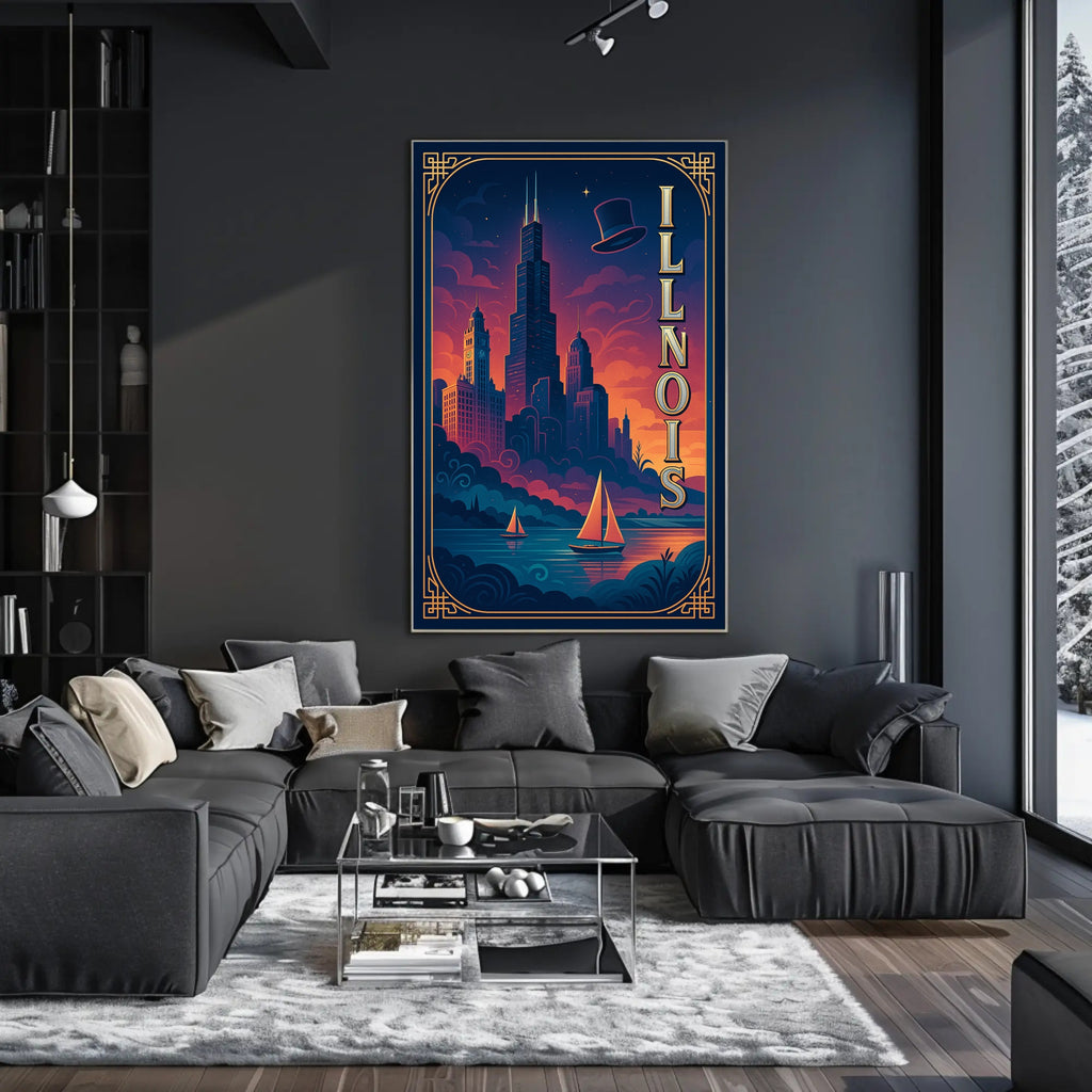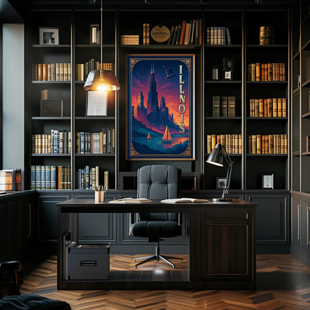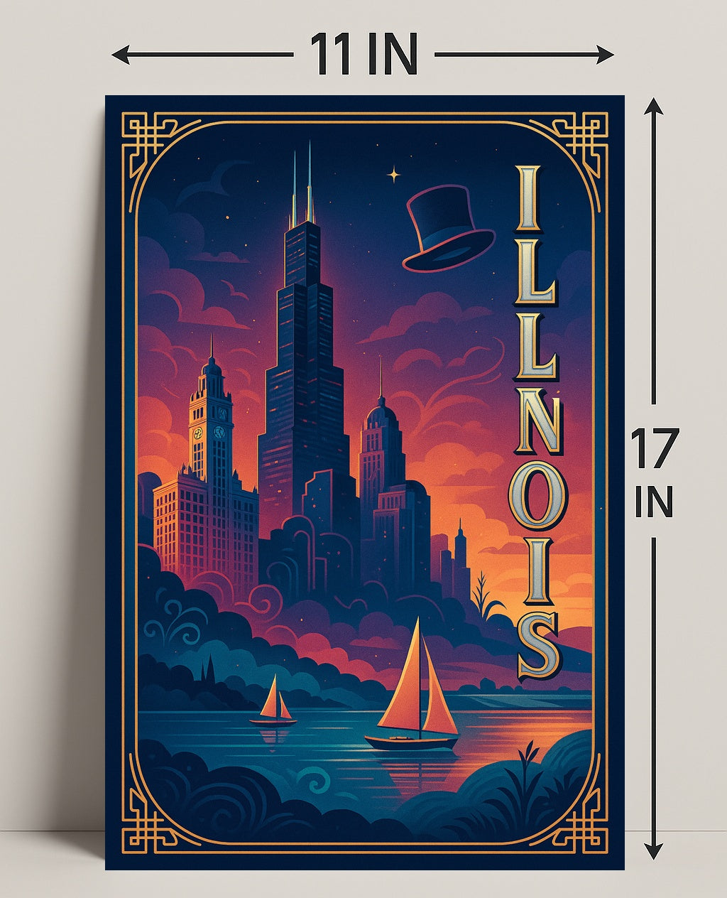 - Striking visual design: Deep navy and warm sunset hues blend with elegant gold linework and vertical “ILLINOIS” lettering to create a cinematic focal point for living rooms, offices, or entryways.