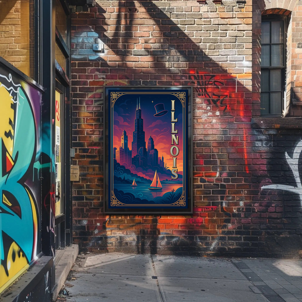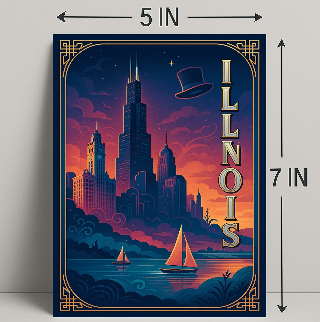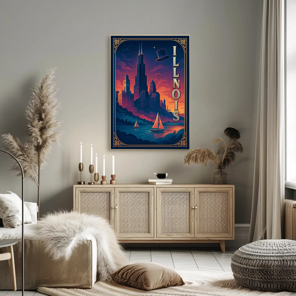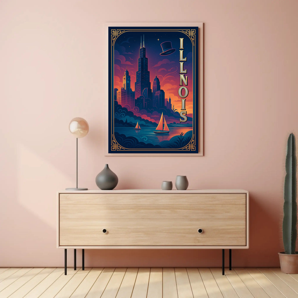 - Striking visual design: Deep navy and warm sunset hues blend with elegant gold linework and vertical “ILLINOIS” lettering to create a cinematic focal point for living rooms, offices, or entryways.