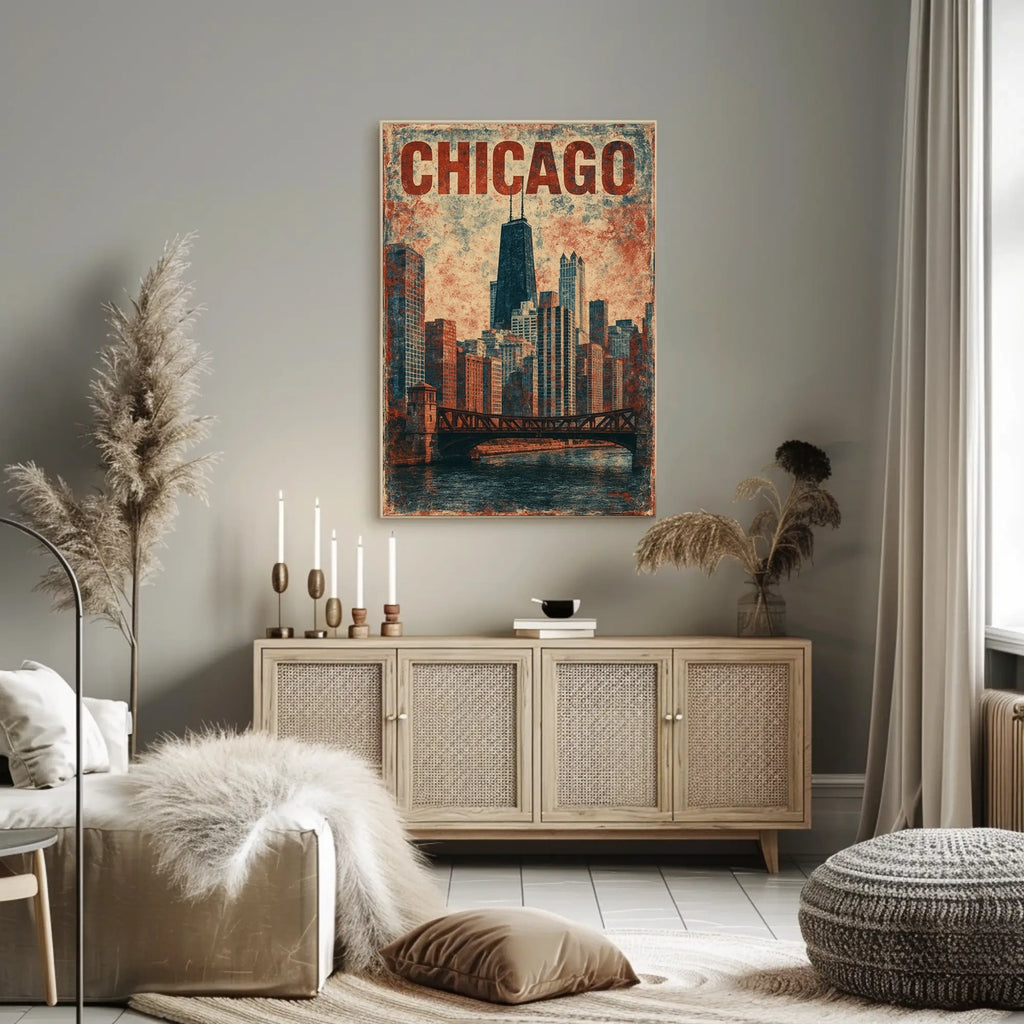 With a muted color palette dominated by reddish-brown and blue tones, this vintage distressed poster evokes nostalgia and aged charm. The bold "CHICAGO" lettering announces the city's architectural marvels and industrial heritage, making it a standout piece for any space.