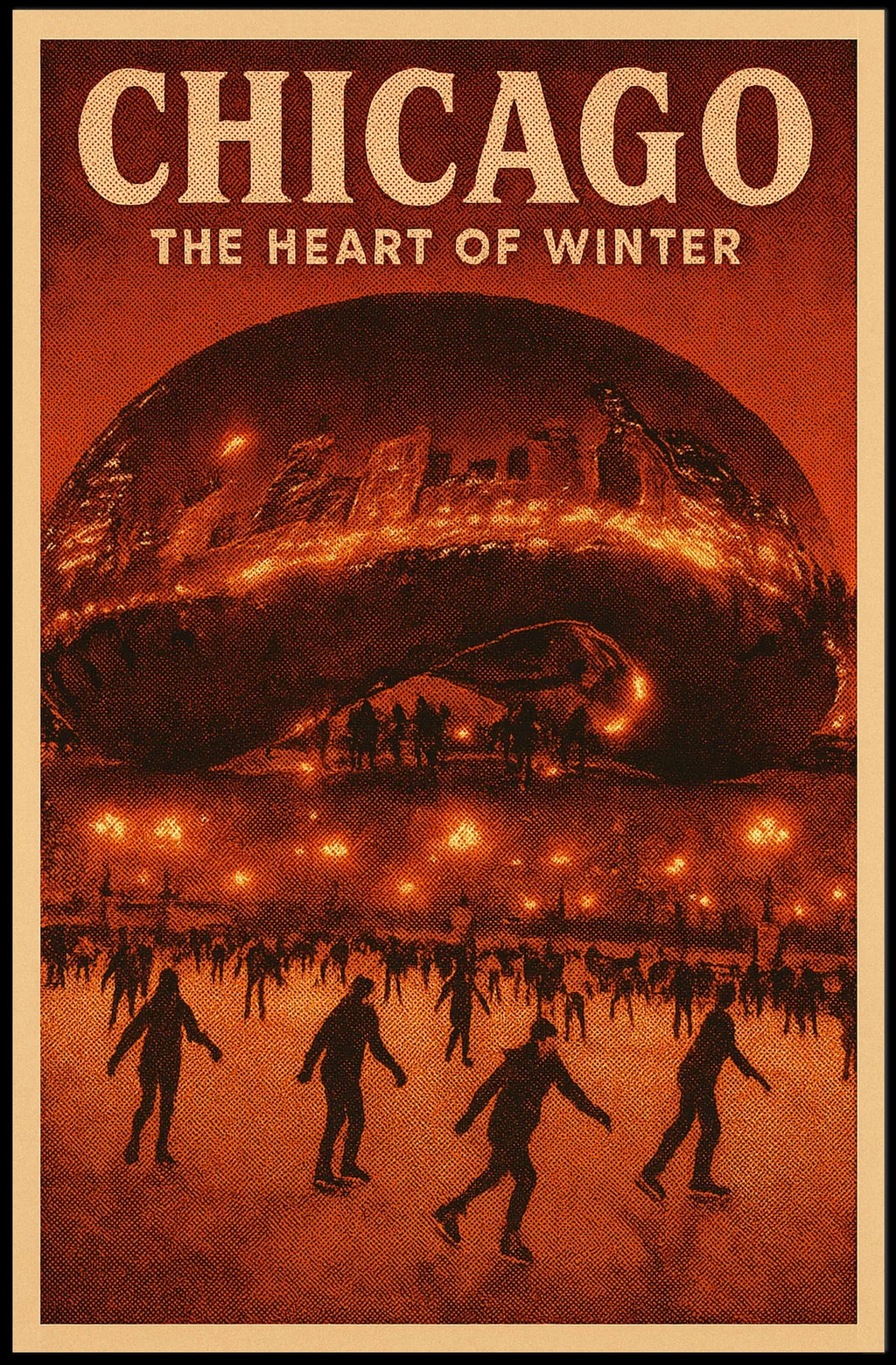 Detailed design highlighting Chicago’s winter scenery and architectural charm