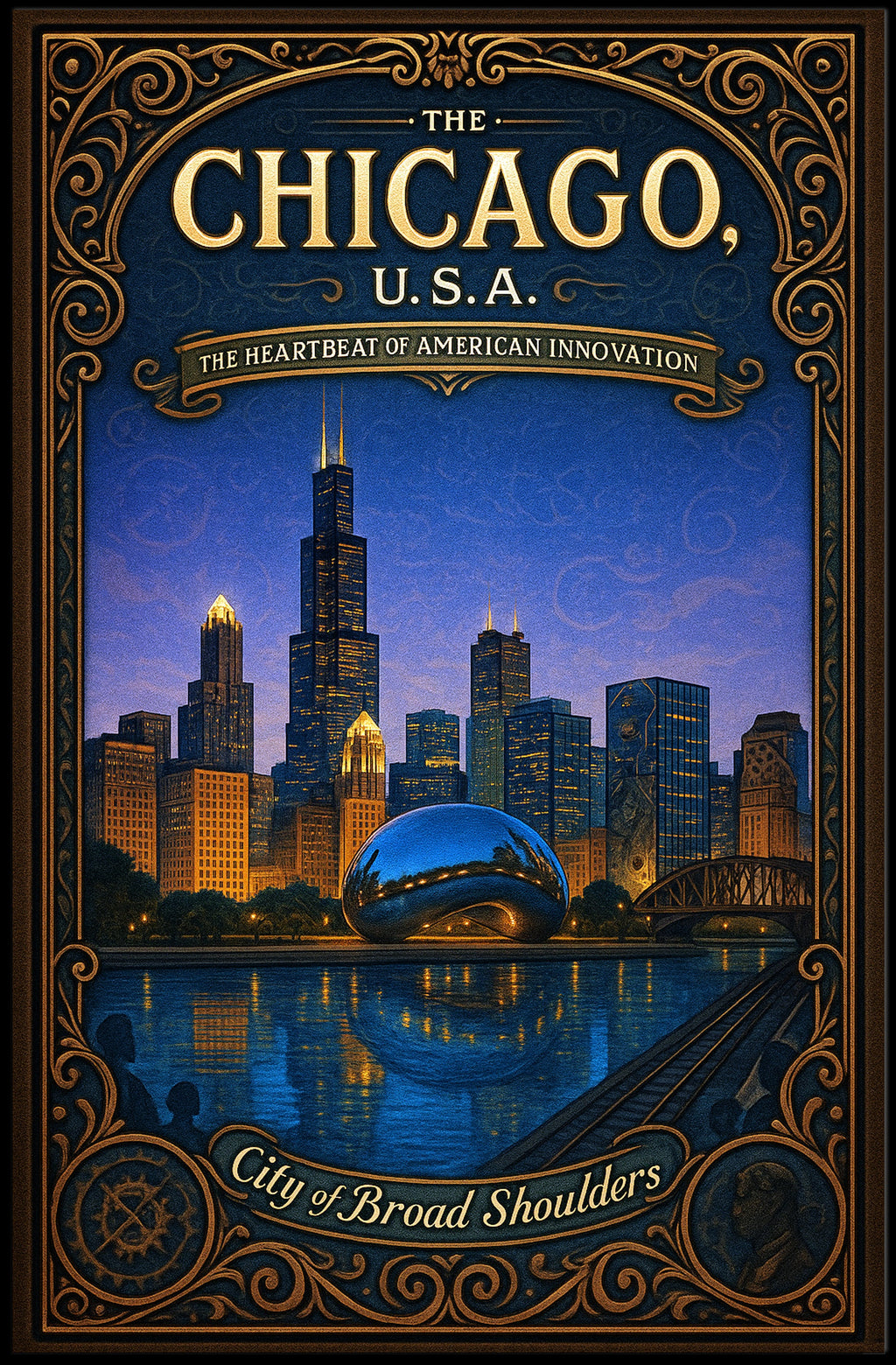 Chicago — The Heartbeat of American Innovation from PosterGoat is a richly detailed art print that brings the iconic Chicago skyline and Cloud Gate (“The Bean”) into your home with vintage-inspired elegance. This 18x24 poster blends modern design with classic ornamentation, making it a standout piece for any living room, office, or gallery wall.