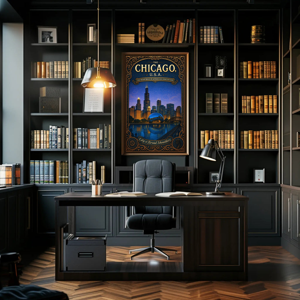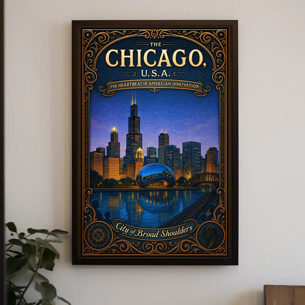 - Ornate, retro frame design: Decorative scrollwork and embossed typography (“CHICAGO, U.S.A.” and “City of Broad Shoulders”) give the poster an antique travel-poster feel while maintaining contemporary appeal.