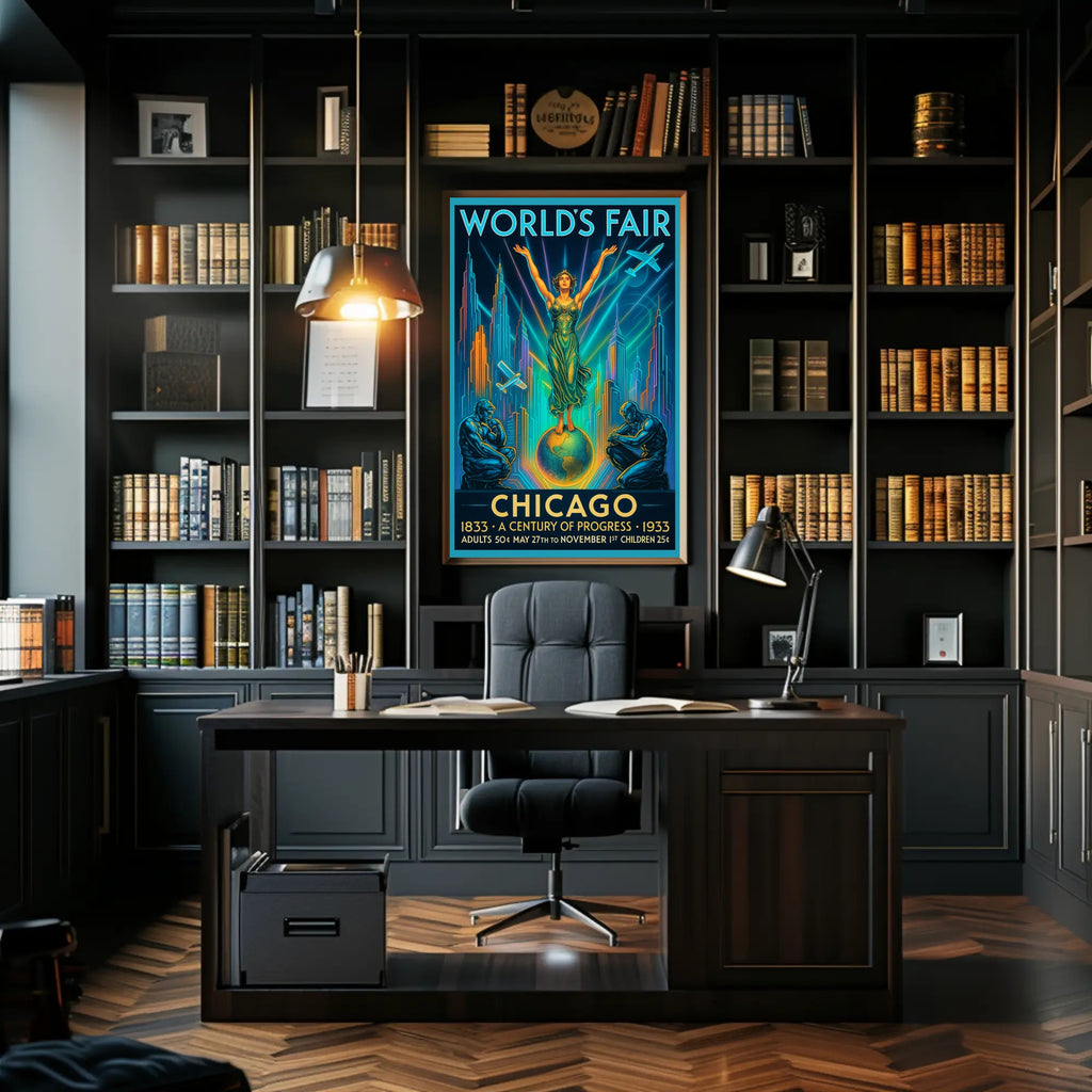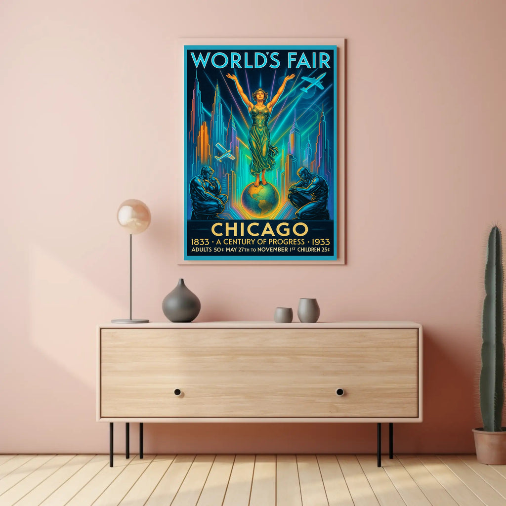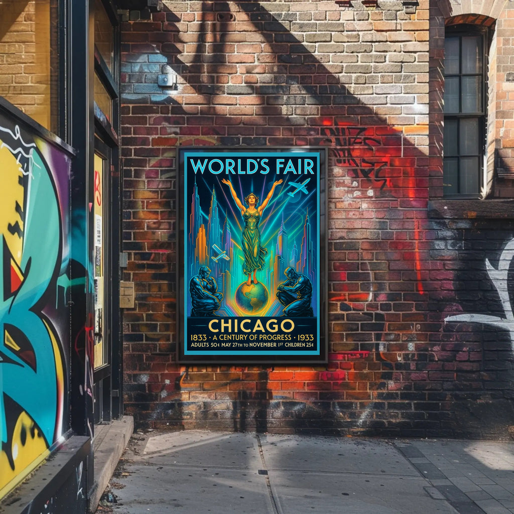 - Design highlights: Vibrant teal and gold palette, Art Deco silhouettes, dramatic light rays, sculptural figures flanking the globe, and crisp typography reading “WORLD'S FAIR” and “CHICAGO” for authentic period feel.