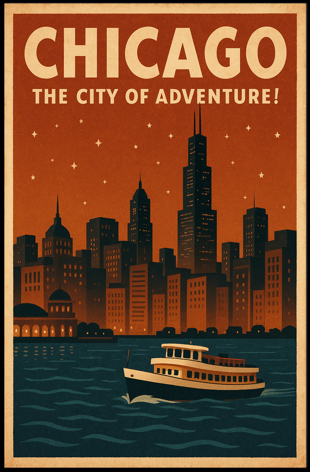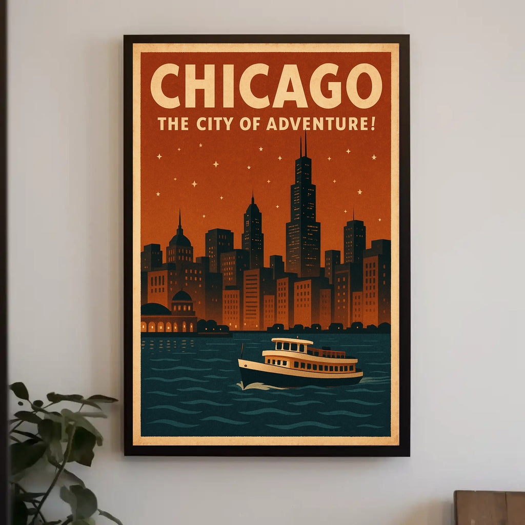 Channel the romance of a lakeside evening with the Chicago's Nighttime Romance Skyline Travel Poster from PosterGoat. This vintage-inspired travel poster captures Chicago’s iconic skyline in warm rust and teal hues — a striking silhouette of skyscrapers, a star-studded sky, and a classic ferry gliding across serene waters. Perfect for travel lovers, architecture enthusiasts, and anyone looking to add a nostalgic, mid-century modern focal point to their home decor.