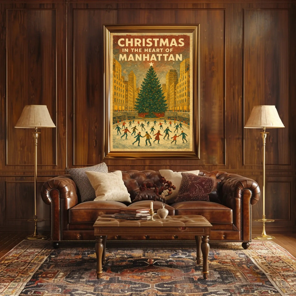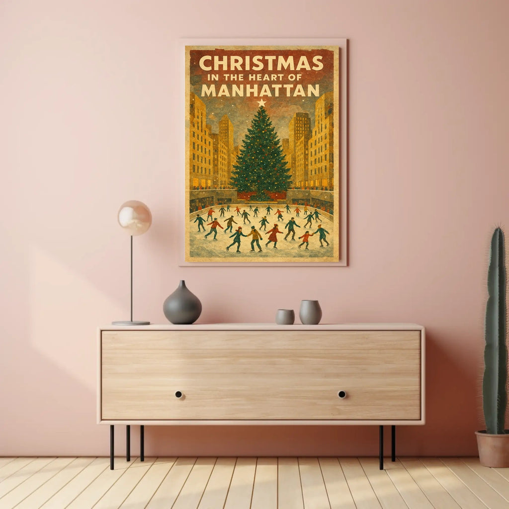 This poster captures the essence of Christmas in the Heart Of Manhattan, blending festive charm with urban imagery to create a compelling focal point in any space.