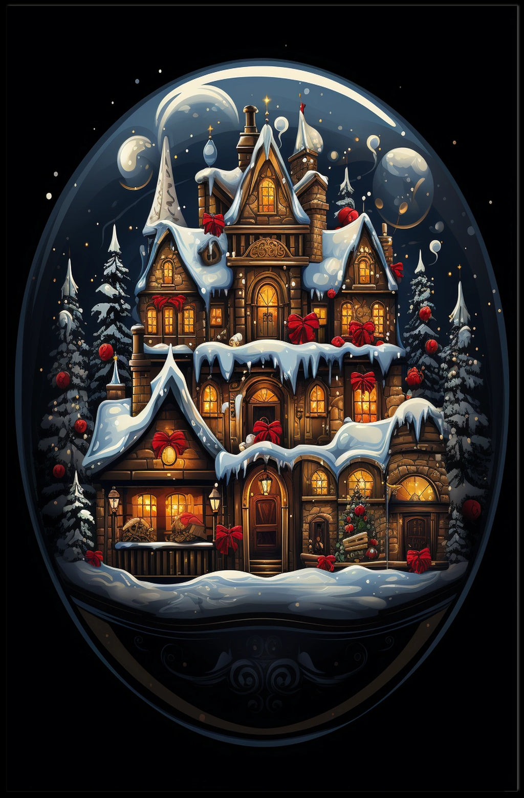 - Detailed design highlighting the Victorian-style home nestled in a snow-covered landscape, warm glowing lights, red bows, and Christmas wreaths