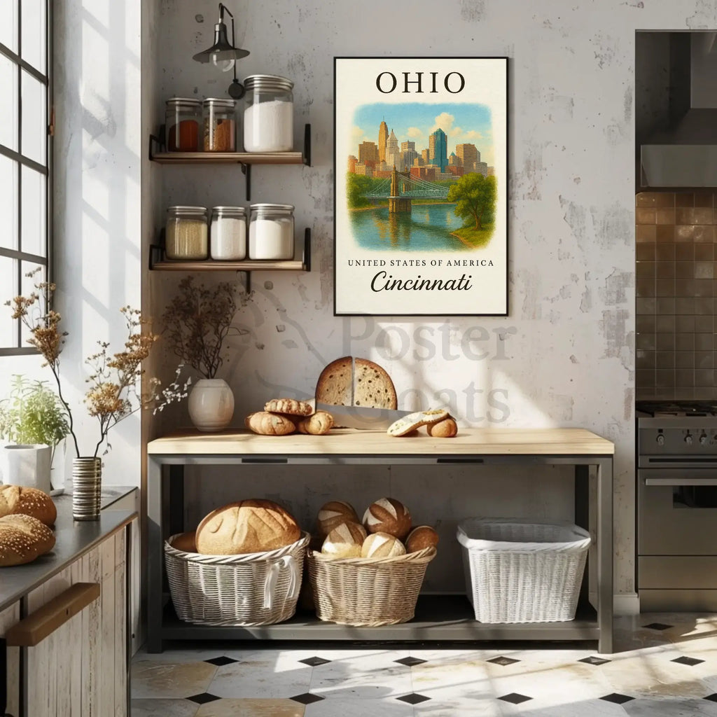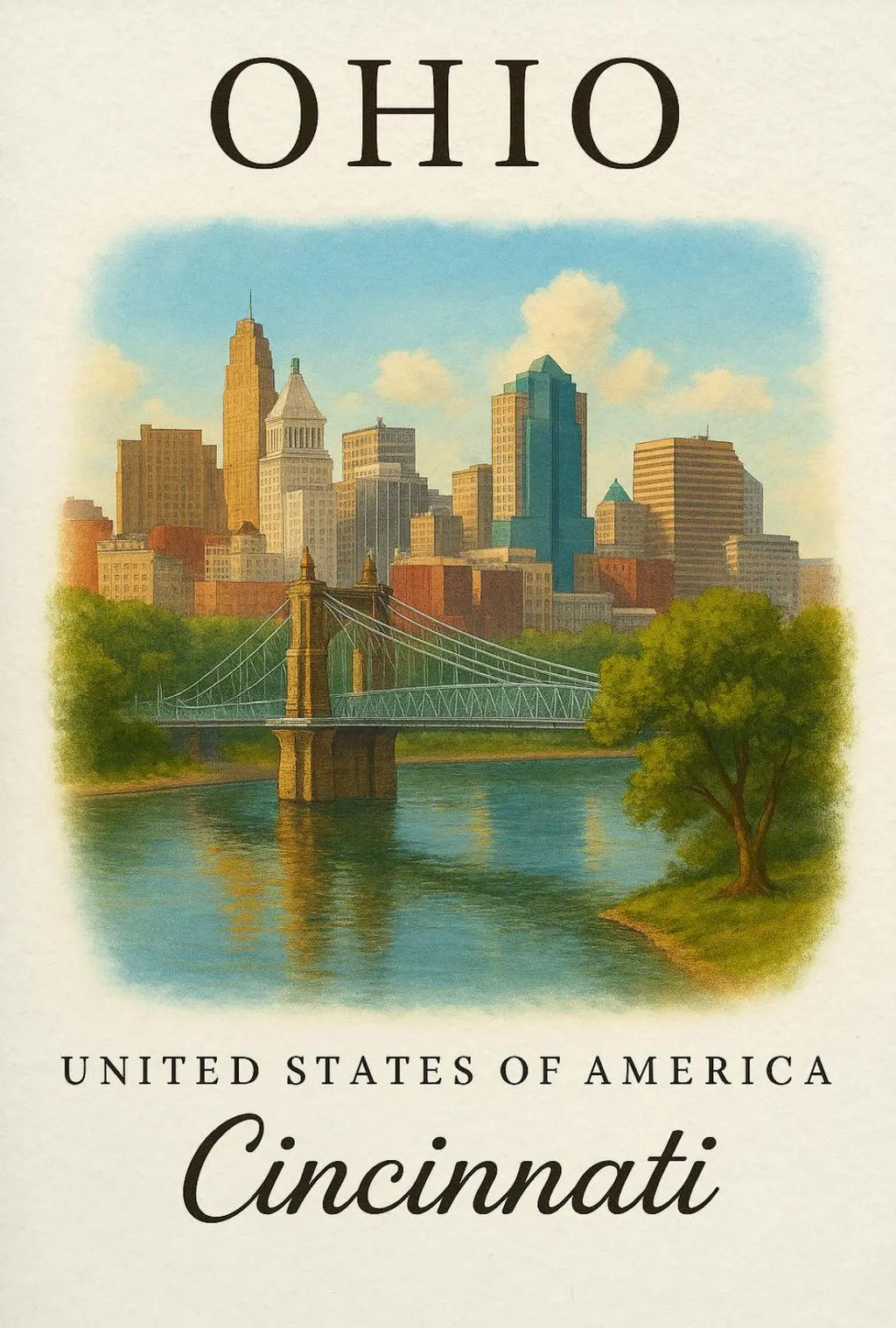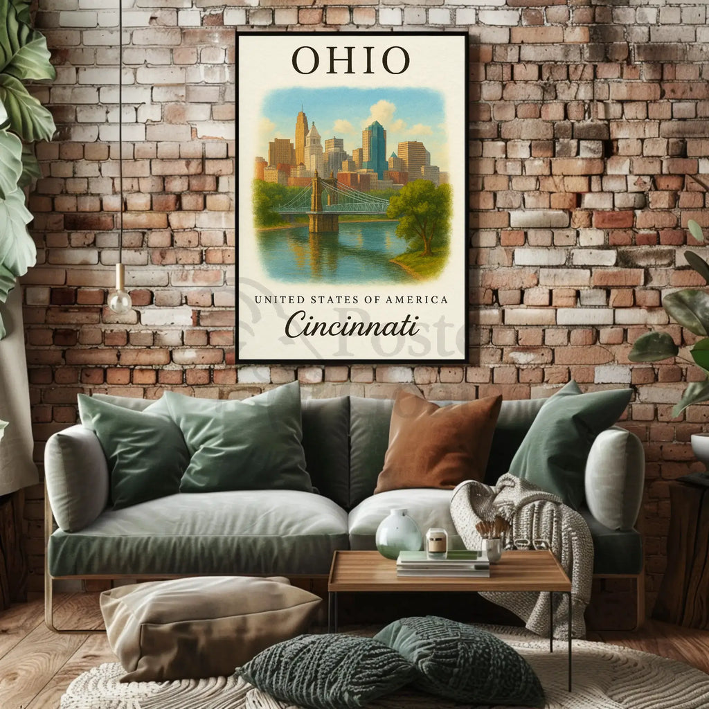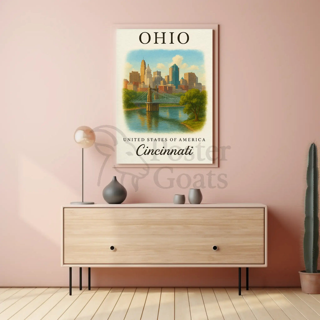 Add a touch of American nostalgia to your walls with this Cincinnati Cityscape Vintage Travel Poster from PosterGoat — order now to bring historic skyline charm and travel-inspired warmth into your home.