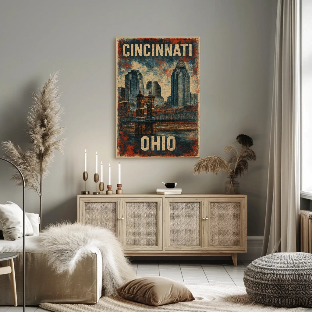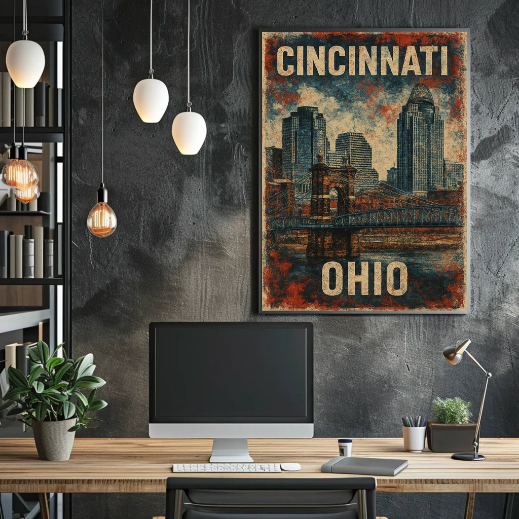 This poster captures the majestic cityscape of Cincinnati, Ohio, with its renowned skyline taking center stage. In the foreground, the iconic John A. Roebling Suspension Bridge gracefully spans the river, a testament to the city's rich architectural heritage. The backdrop hosts several recognizable high-rise buildings, each contributing to the urban narrative. Crafted in a vintage style, the use of distressed textures and a limited color palette of blue, red, and beige lends the piece a nostalgic, weathered charm. Perfect for enthusiasts of urban pride, it embodies Cincinnati's enduring architectural and cultural significance.