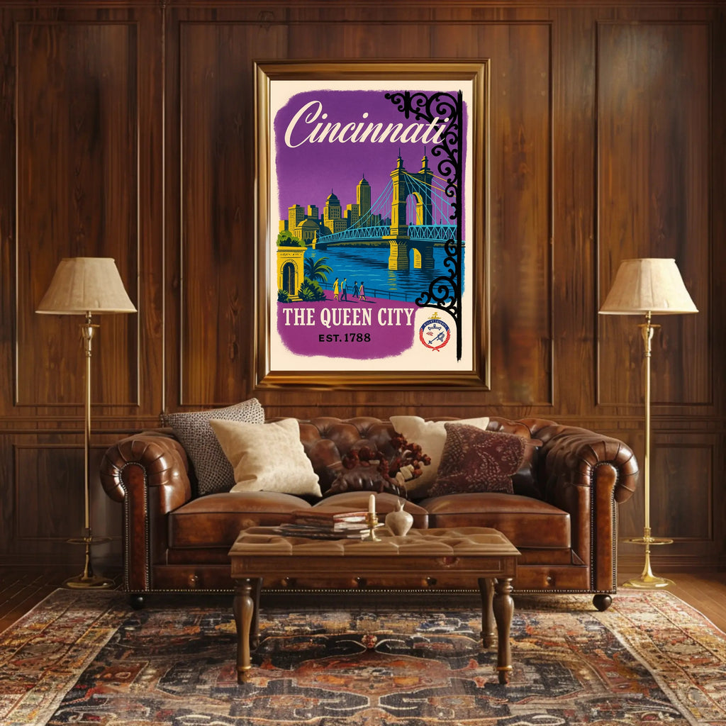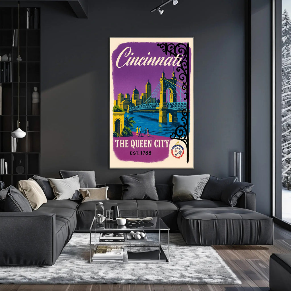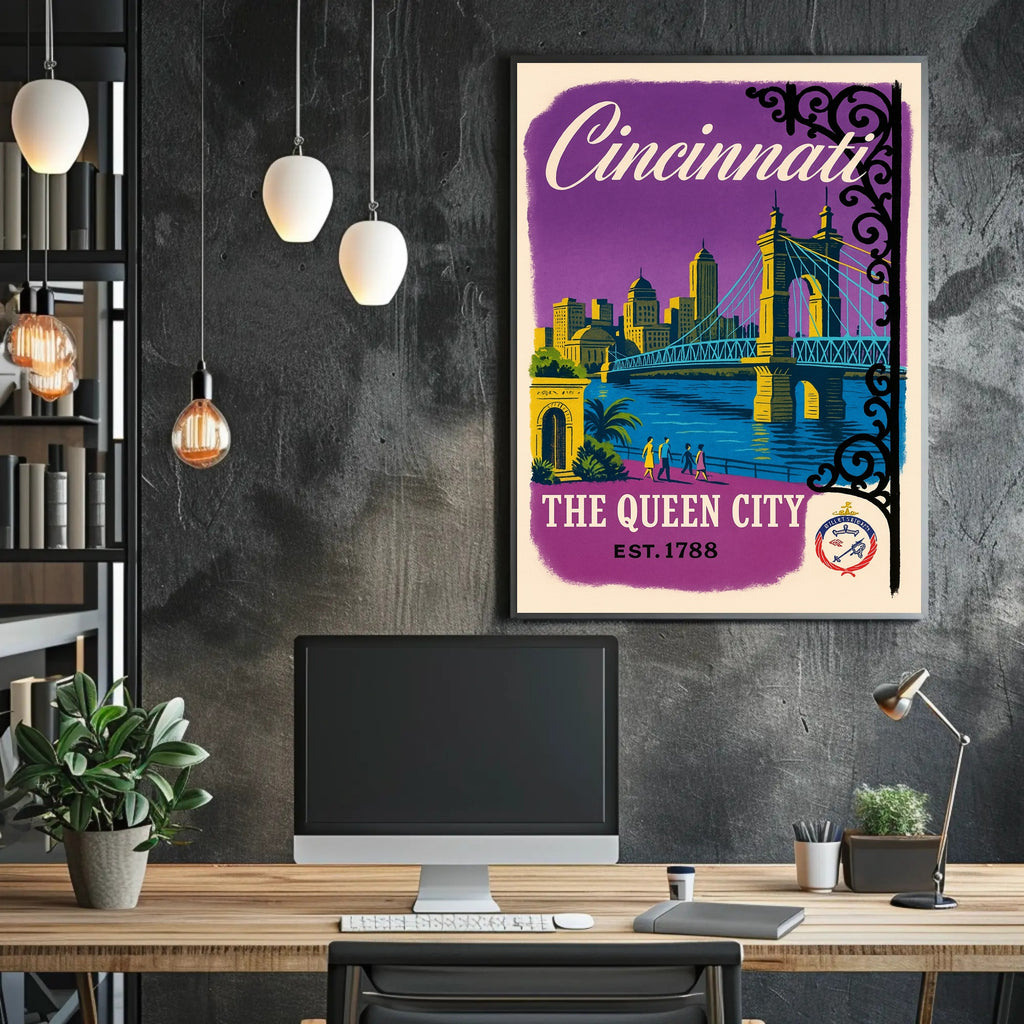 Add timeless urban style to your walls—order this Cincinnati Skyline Vintage Travel Poster from PosterGoat today and celebrate "The Queen City" in retro flair.