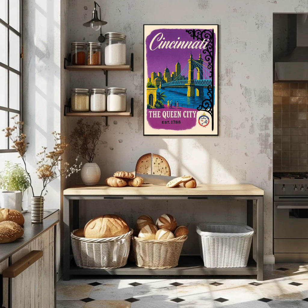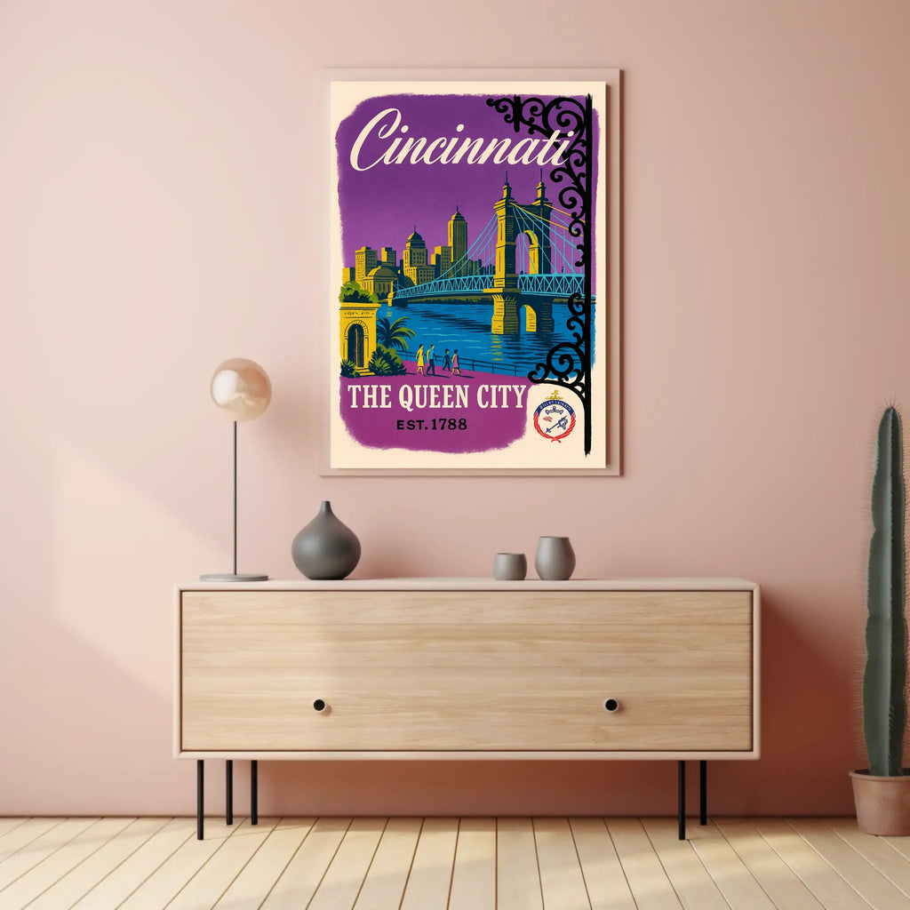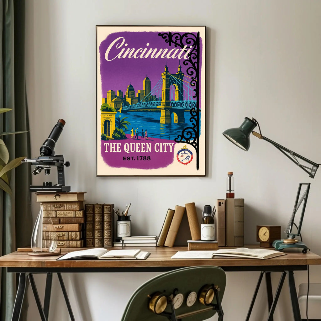 Bring a piece of Cincinnati history home with this striking vintage-style travel advertisement poster from PosterGoat. Rendered in a bold, limited color palette of purple, teal and golden yellow, the design highlights the John A. Roebling Suspension Bridge, the riverfront skyline and decorative scrollwork for an authentic mid-century travel poster feel.