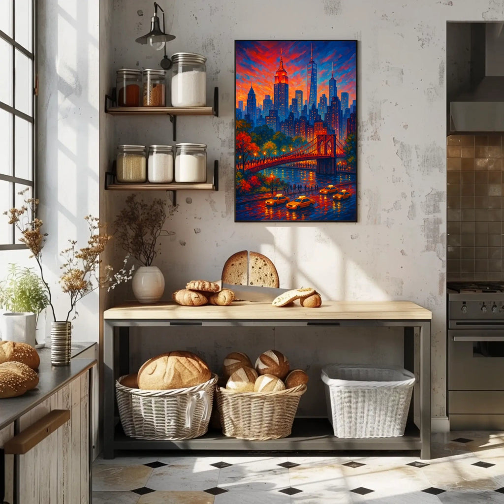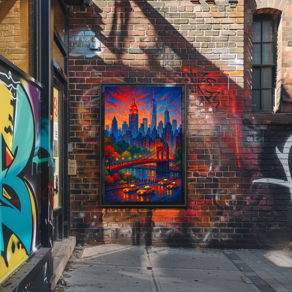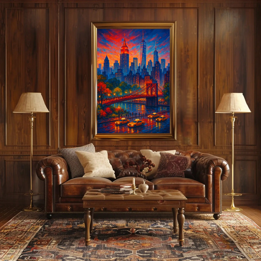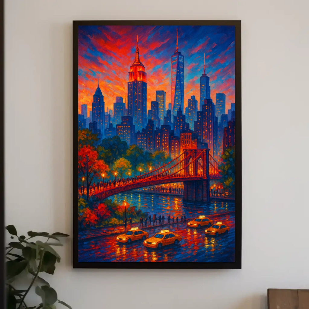 City Lights at Dusk captures the enchanting moment when day softens into night. This vivid cityscape painting celebrates urban energy, blending a sunset palette with a bustling skyline. The iconic bridge glows above the river while yellow taxis thread through neon-lit streets, inviting viewers to step into a moment of twilight magic and urban life.