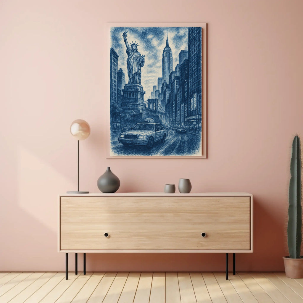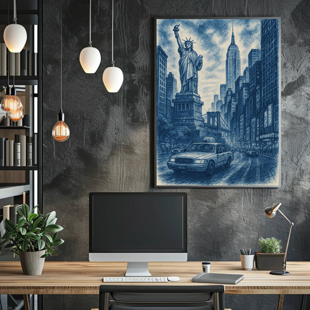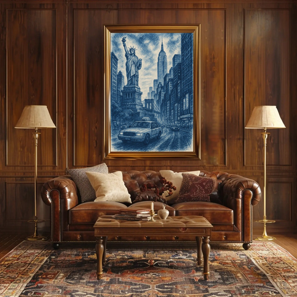 Immerse yourself in the vibrant energy of New York City with City of Dreams, a stunning artistic depiction that blends iconic landmarks into a luminous urban panorama. This piece captures the timeless allure of the city that never sleeps, featuring the Statue of Liberty, the Empire State Building, and the Brooklyn Bridge, with a classic yellow taxi weaving through the scene.